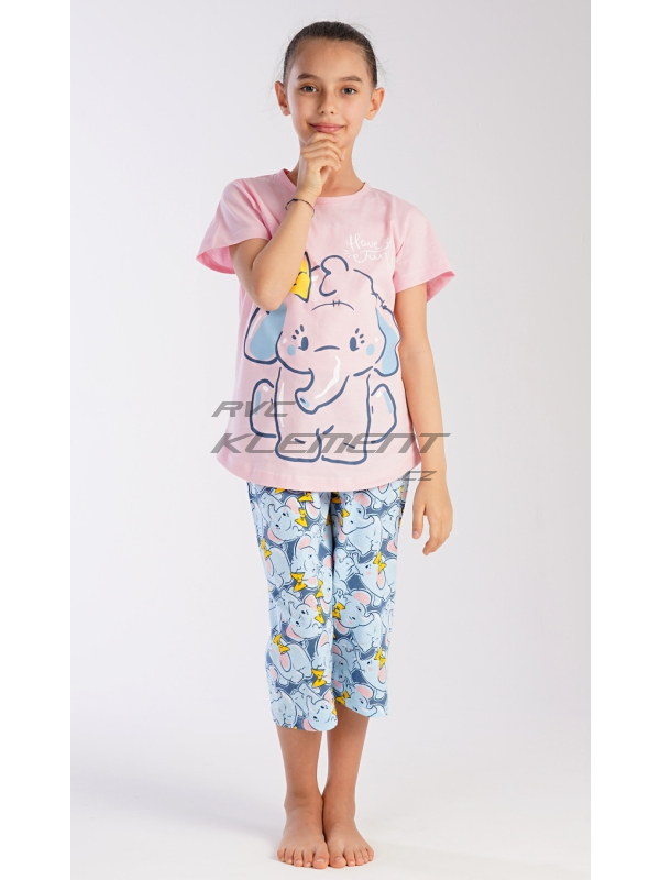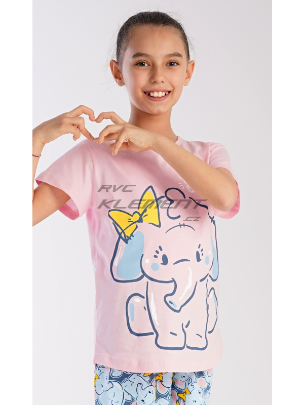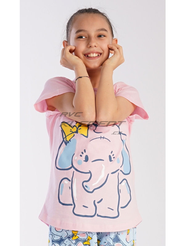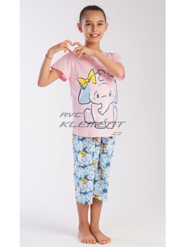 Dětské bavlněné pyžamo kapri Slůně. Dětské pyžamo se skládá z trička s krátkým rukávem a tříčtvrtečních kalhot. Na jednobarevném tričku je velký obrázek slůněte. Tento motiv se opakuje i na kalhotách. Použitý bavlněný materiál je příjemný a poddajný na dotek.
