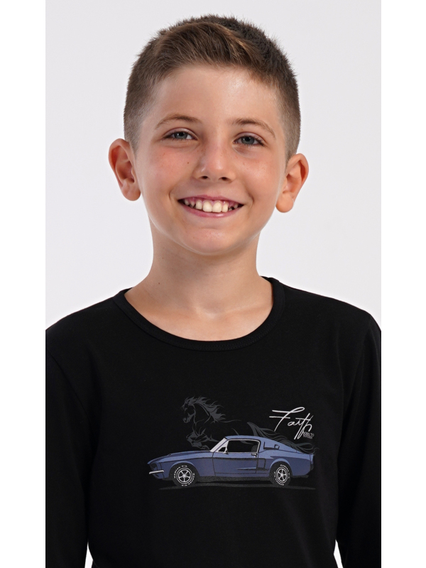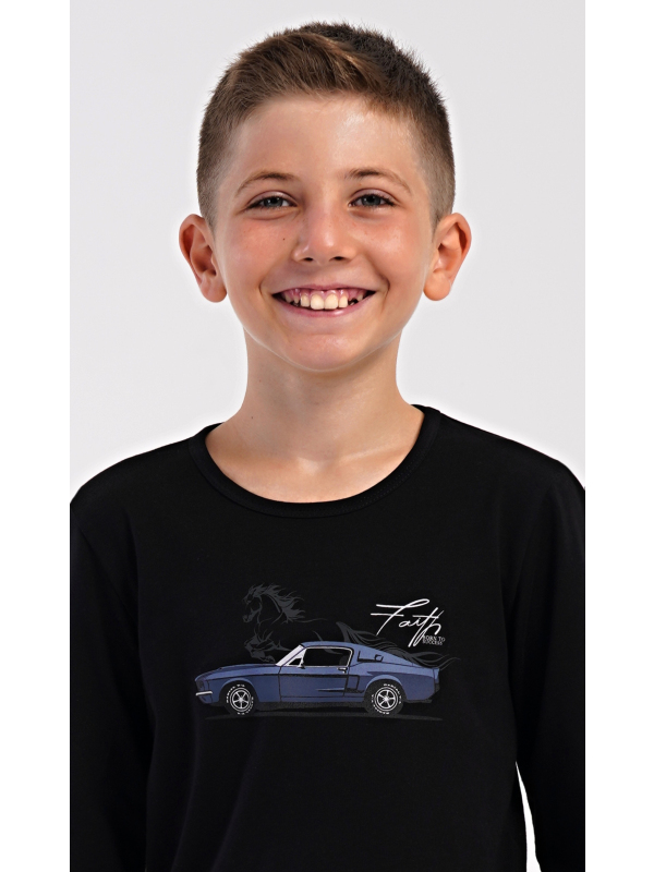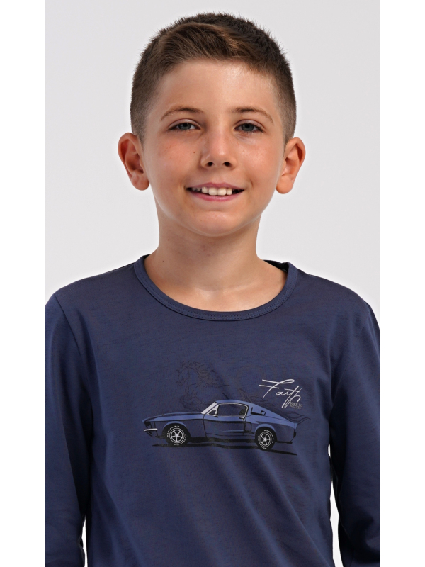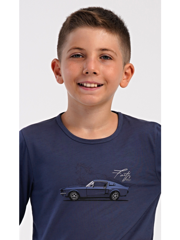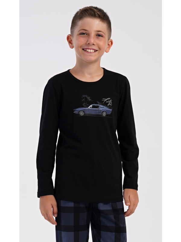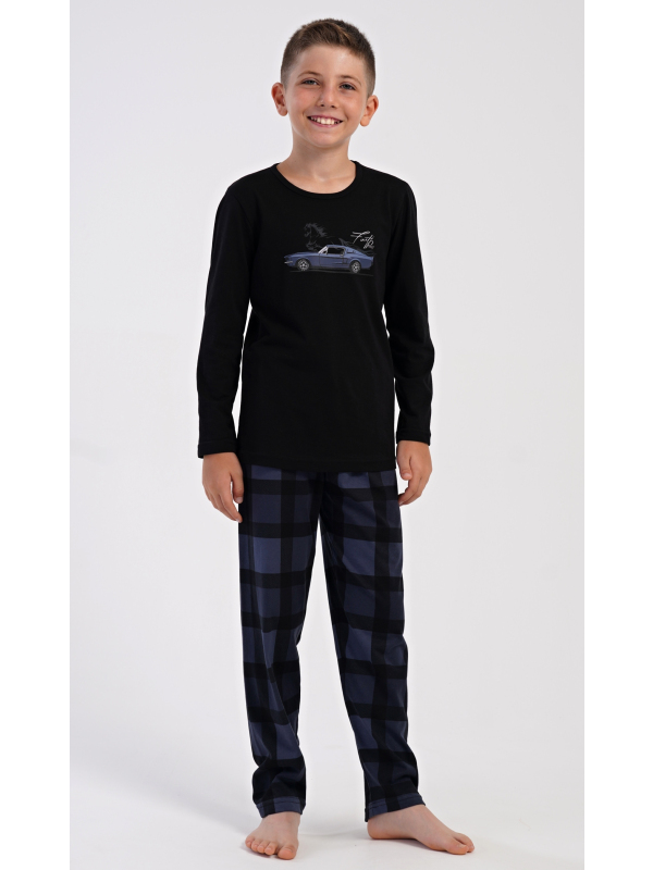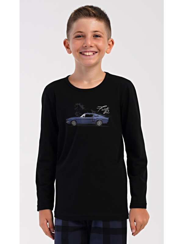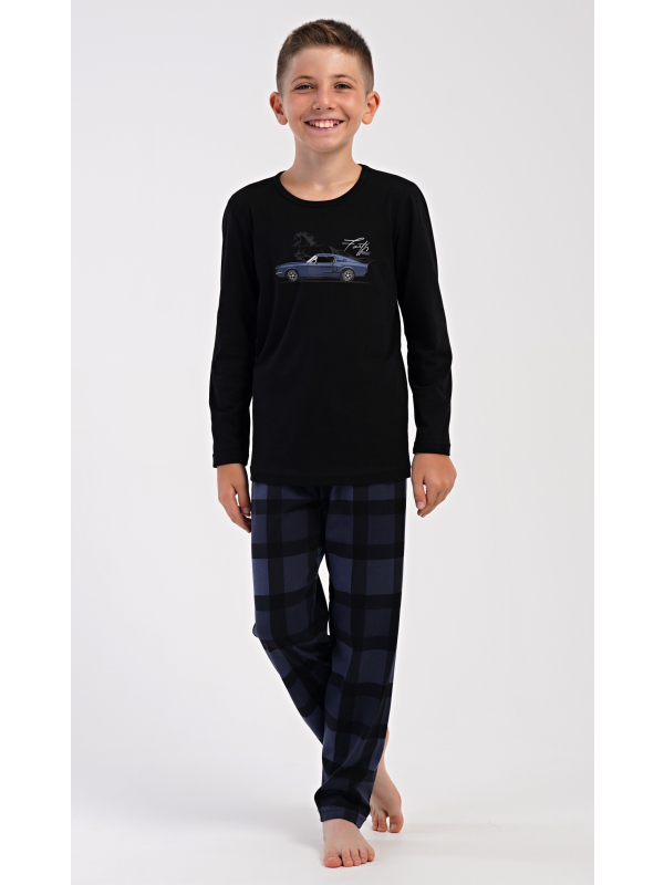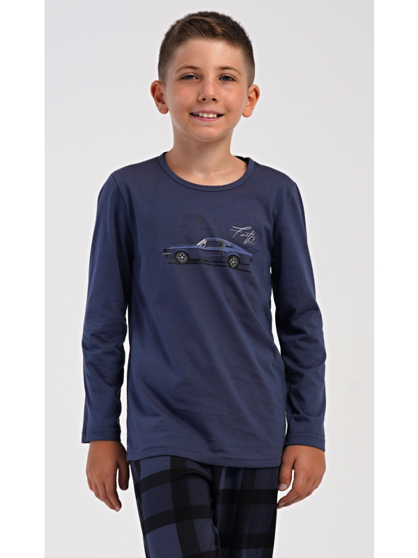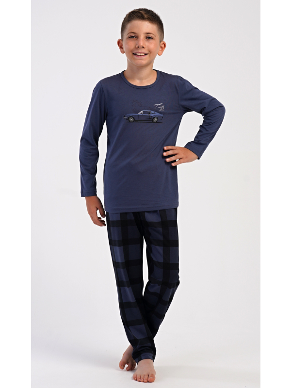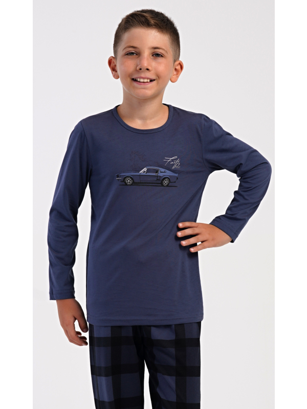Dětské bavlněné pyžamo s dlouhým rukávam Speed. Dětské bavlněné dlouhé pyžamo Speed. Chlapecké pyžamo se skládá z trika s dlouhým rukávem a dlouhých kalhot. Triko s kulatým výstřihem je ozdobeno obrázkem sportovního auta. Kárované kalhoty mají v pase gumu a šňůrku na stažení, nemají kapsy. Použitý bavlněný materiál je poddajný a příjemný na dotek. Pokyny pro údržbu: - 100% bavlna Míry naměřené na výrobku: