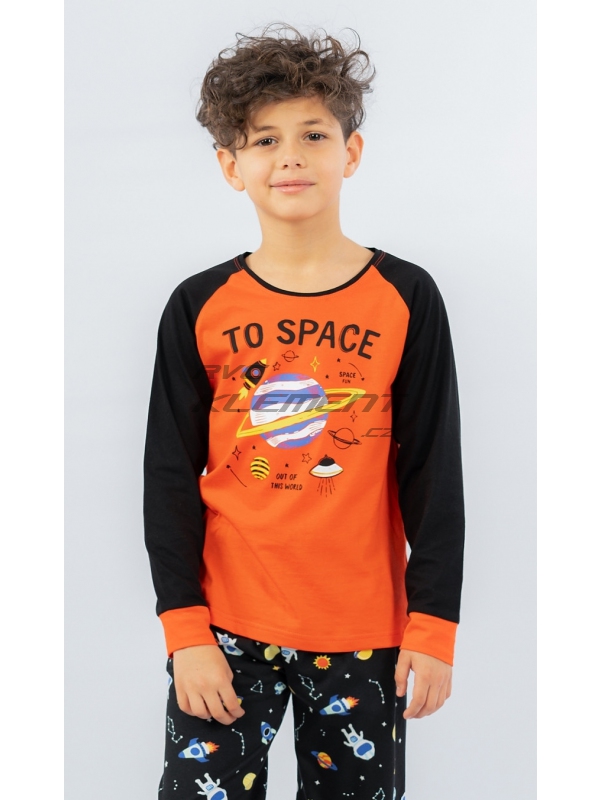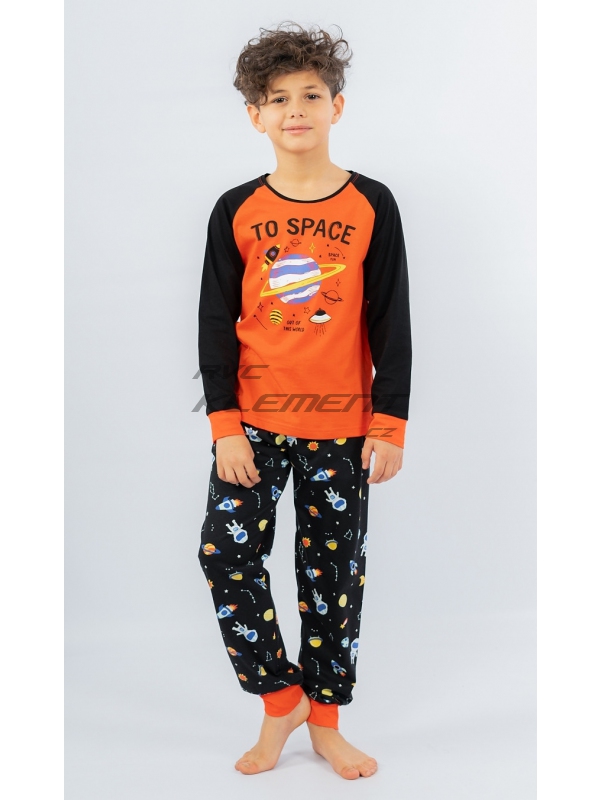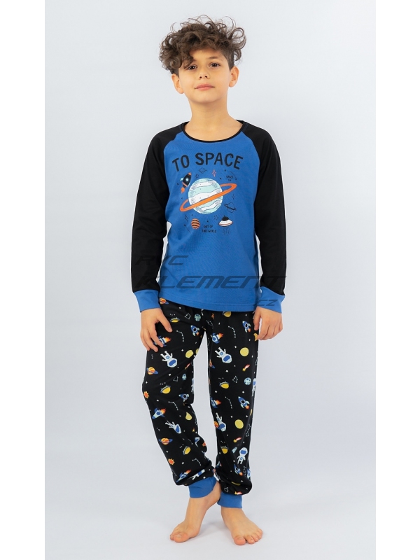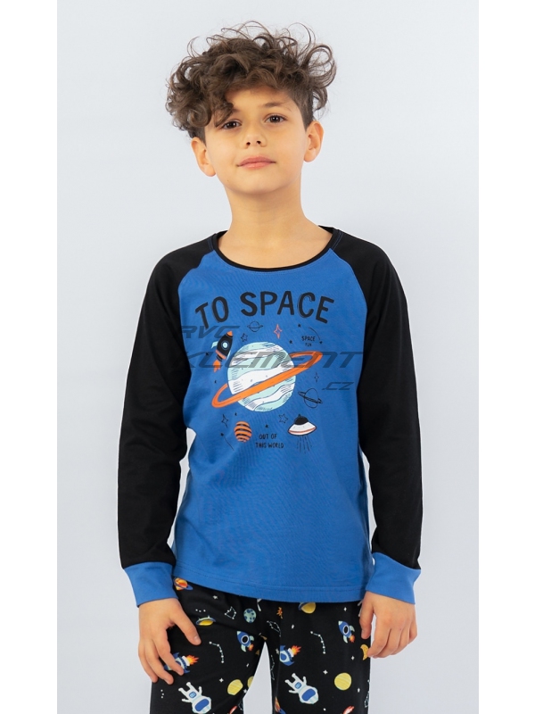 Dětské bavlněné pyžamo dlouhé Vesmír. Dětské pyžamo se skládá z trika s dlouhým rukávem a dlouhých kalhot. Na triku je obrázek vesmíru s nápisem ’Out of this World-To Space’. Rukávy jsou barevně odlišené, zakončené panty v barvě trika. Dlouhé kalhoty potištěné vesmírnými motivy mají také panty, v pase je guma, nemají kapsy. Použitý bavlněný materiál je příjemný a poddajný na dotek.