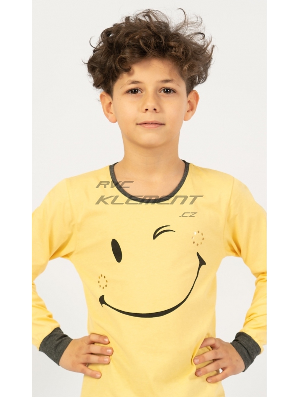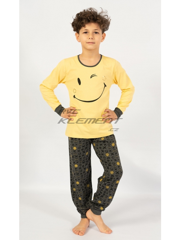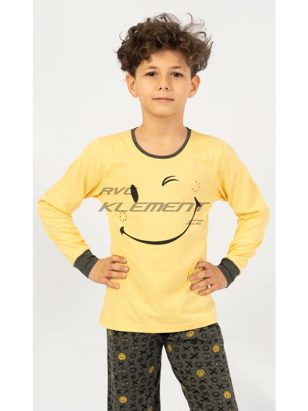 Dětské pyžamo dlouhé Patrik. Dětské pyžamo dlouhé Patrik. Dětské pyžamo se skládá z trika s dlouhým rukávem a dlouhých kalhot. Na triku je obrázek rozesmátého smajlíka, tento motiv se opakuje i na kalhotách. Kalhoty mají v pase gumu, nemají kapsy. Použitý materiál je příjemný a poddajný na dotek. Obsah bavlny u trika je 100%, u kalhot 70%. Pokyny pro údržbu: - 100% bavlna Míry naměřené na výrobku: