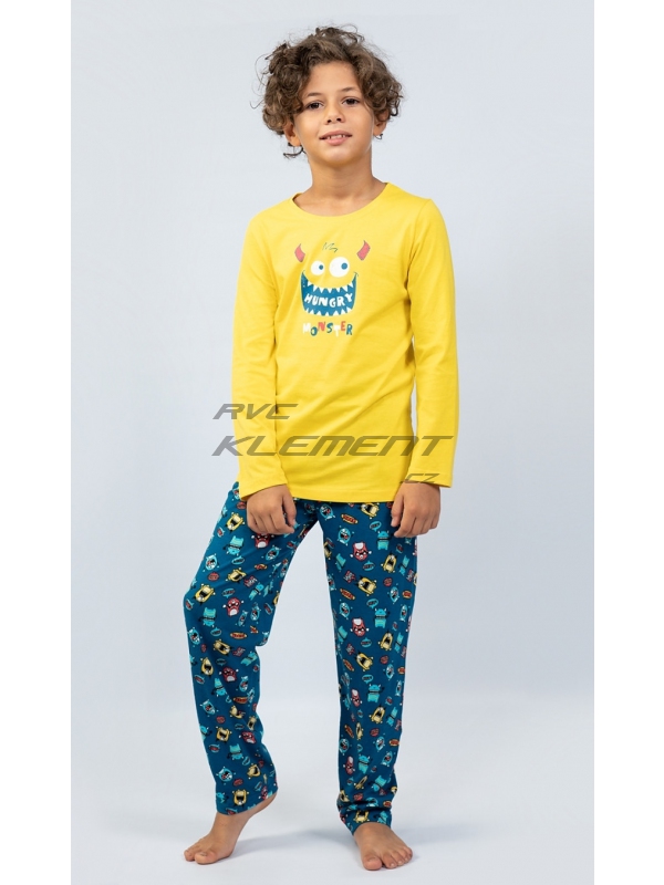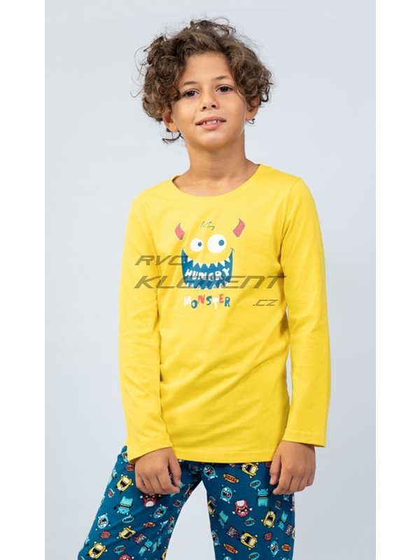 Dětské bavlněné pyžamo dlouhé Monster. Dětské pyžamo se skládá z trika s dlouhým rukávem a dlouhých kalhot. Na triku je obrázek rozesmáté hladové příšerky, podobný motiv se opakuje i na dlouhých kalhotách. Použitý bavlněný materiál je příjemný a poddajný na dotek.