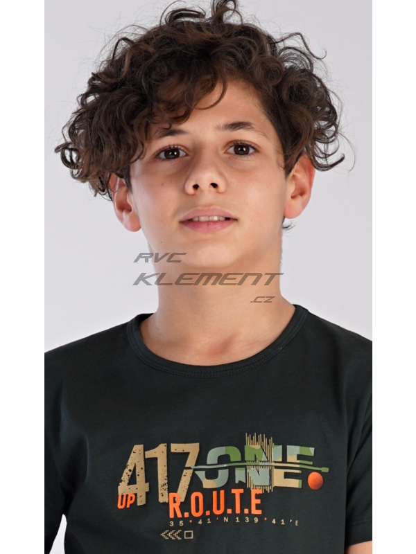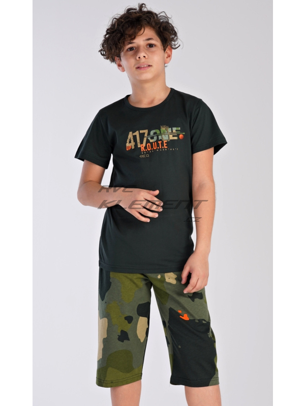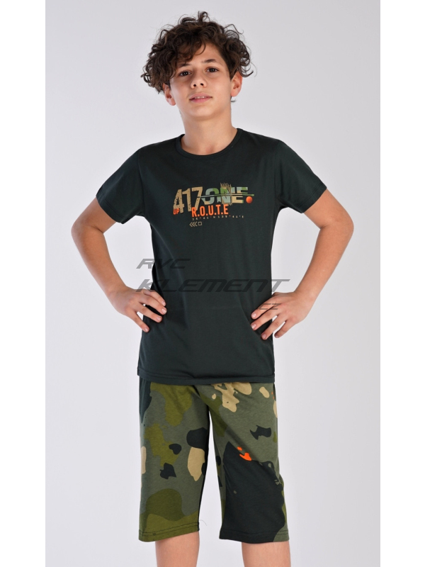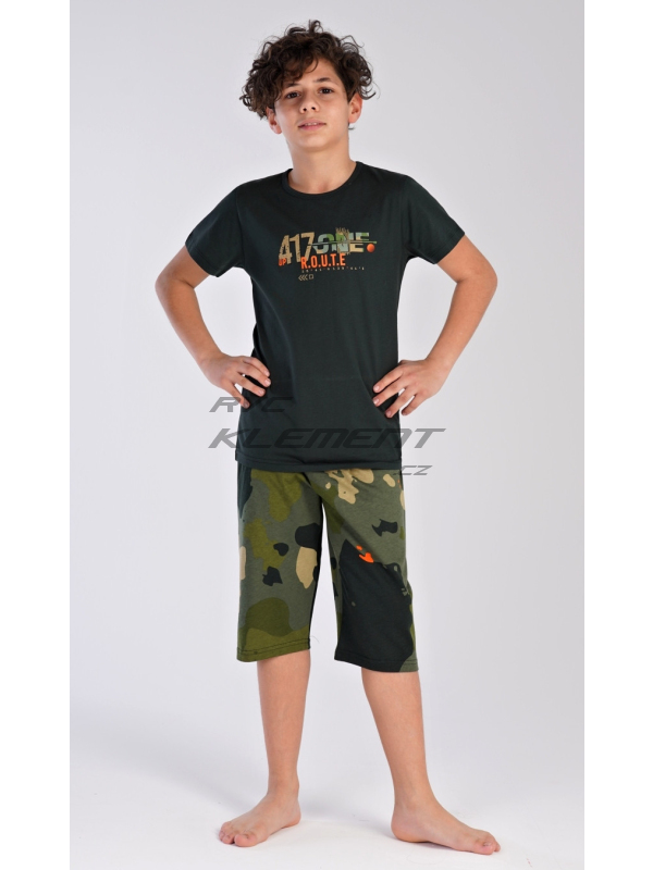 Dětské bavlněné pyžamo kapri Army. Dětské bavlněné pyžamo kapri Army. Dětské pyžamo se skládá z trička s krátkým rukávem a tříčtvrtečních kalhot. Na jednobarevném tričku s kulatým výstřihem je nápis ’417 one route’. Maskáčové kapri kalhoty mají v pase gumu, nemají kapsy. Použitý bavlněný materiál je příjemný a poddajný na dotek. Pokyny pro údržbu: - 100% bavlna Míry naměřené na výrobku: