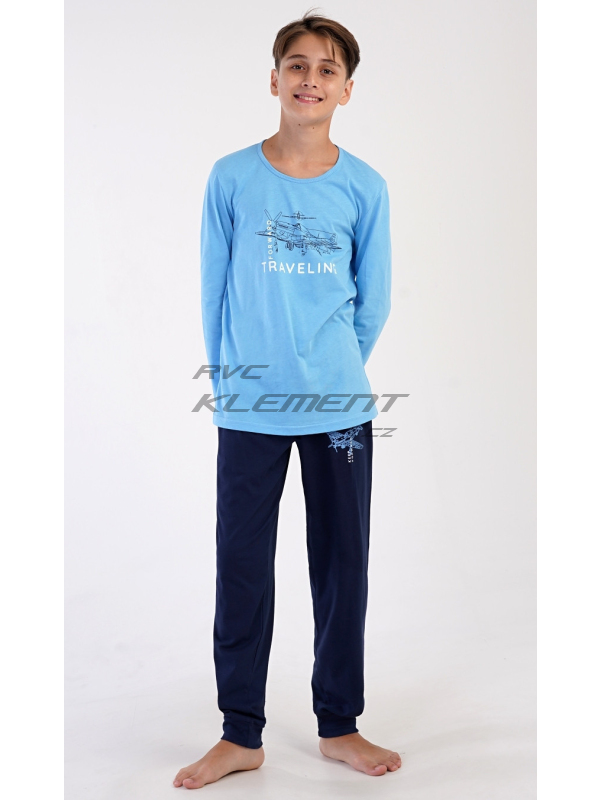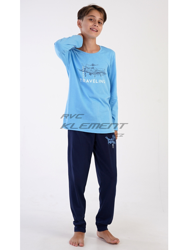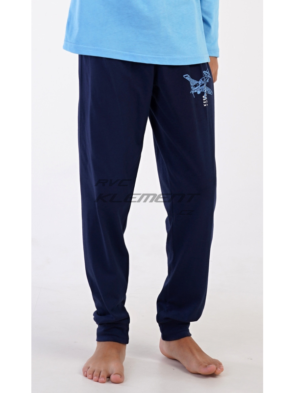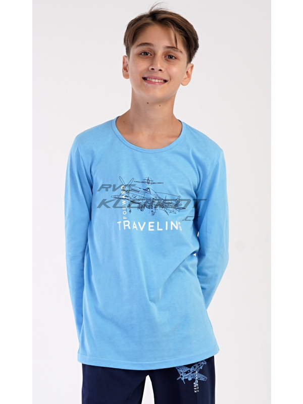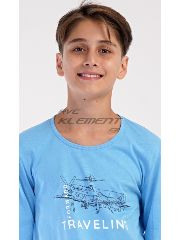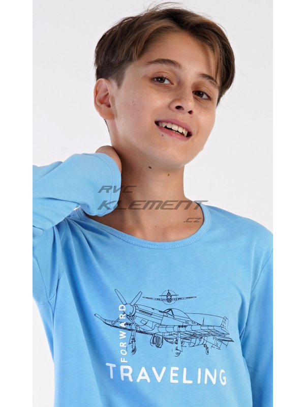 Dětské chlapecké pyžamo Letadlo. Dětské chlapecké bavlněné pyžamo Letadlo. Pyžamo se skládá z trika s dlouhým rukávem a dlouhých kalhot. Triko s kulatým výstřihem zdobí obrázek letadla a nápis ’Traveling forward’. Jednobarevné dlouhé kalhoty mají v pase gumu a jsou zakončeny lemy. Použitý bavlněný materiál je příjemný a poddajný na dotek. Pokyny pro údržbu: - 100% bavlna Míry naměřené na výrobku: