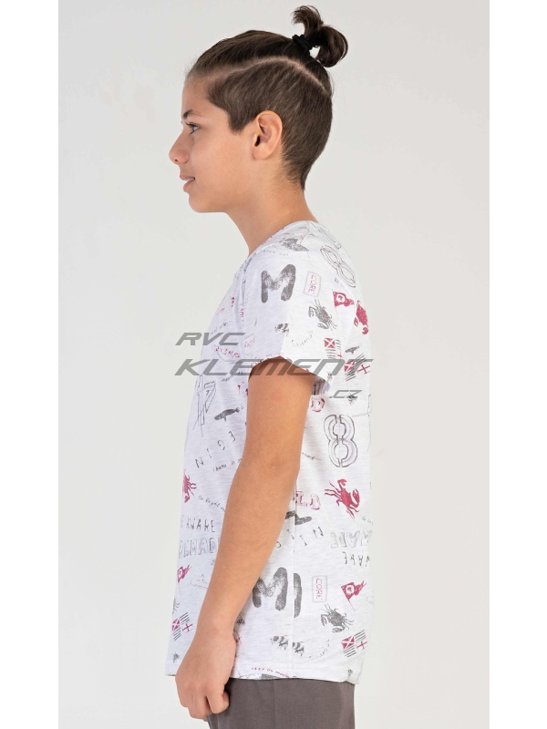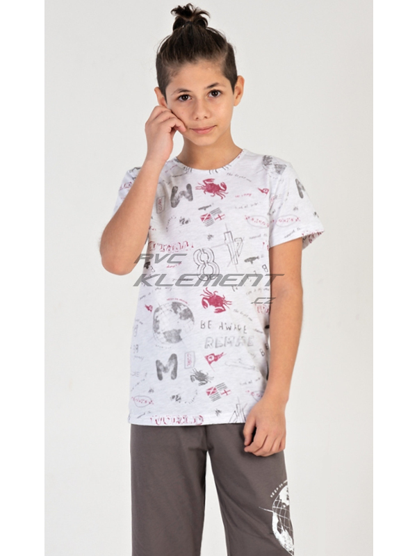 Dětské chlapecké kapri pyžamo Kuba. Dětské pyžamo se skládá z trička s krátkým rukávem a tříčtvrtečních kalhot. Tričko je potištěno motivy moře a cestování. Jednobarevné kapri kalhoty mají v pase gumu, nemají kapsy. Použitý bavlněný materiál je příjemný a poddajný na dotek. Obsah bavlny u trička je 70% a u kalhot 100%.