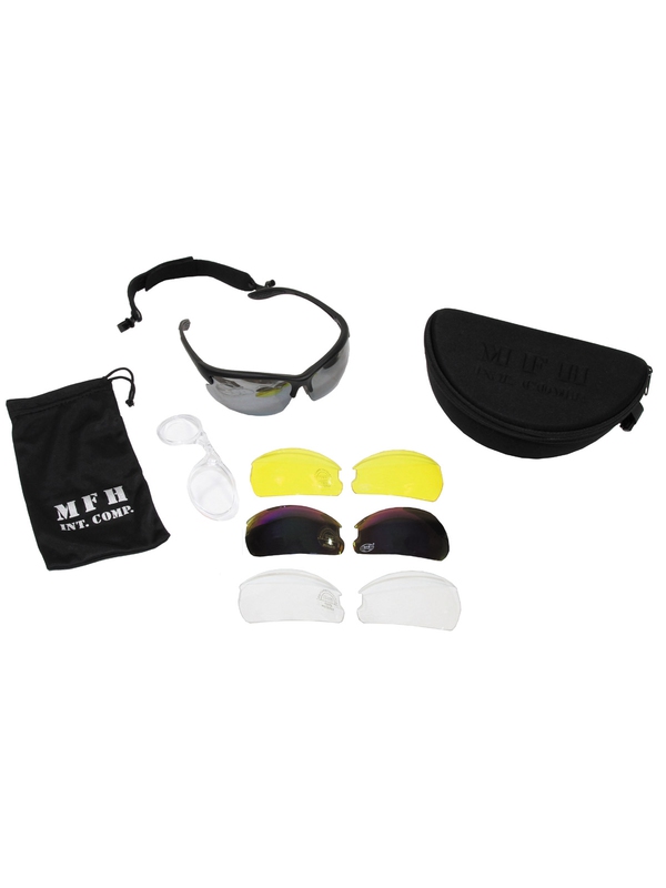 Černé testované armádní sportovní brýle STRIKE s náhradními barevnými skly, textilním obalem a pouzdrem. | ||