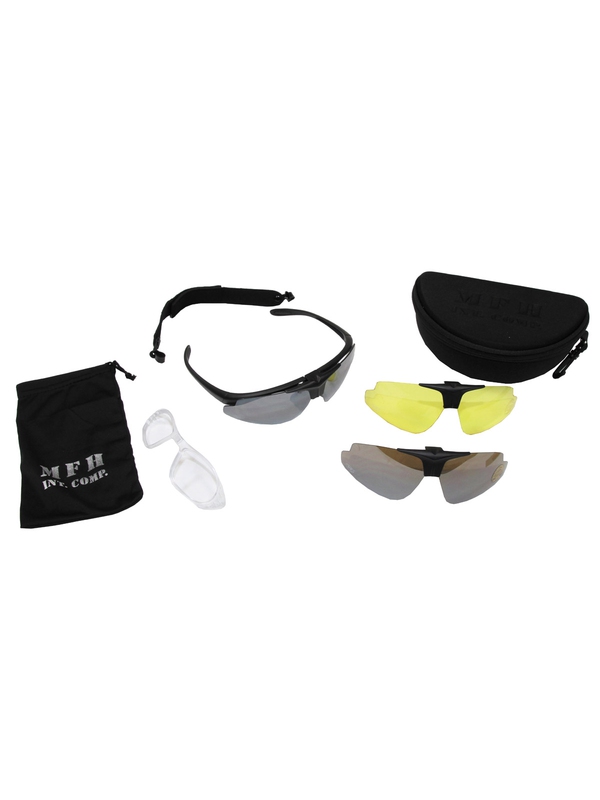 Černé testované armádní sportovní brýle HAWK s náhradními barevnými skly, popruhem, textilním obalem a pouzdrem. | ||