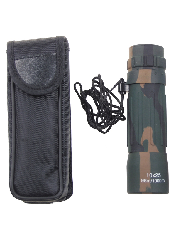 Praktický monodalekohled umožní desetinásobné zvětšení při průměru objektivu: 25 mm. Zorné pole: 96 m do 1000 m, dioptrická korekce jemná, hmotnost: 82 g. Praktický dalekohled v pogumovaném designu woodland, má šnůrku na krk a skladné nylonové pouzdro na opasek.