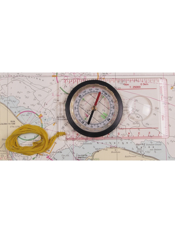 Kompas mapový s obdélníkovou základnou z průhledného plastu, s lupou. Buzola je vyrobena z průhledného plastu, velikost 11 x 6 cm. Na růžici jsou fluorescenční znaky, které se hodí při špatné viditelnosti. Na delších stranách jsou dvě měřítka k odečítání vzdáleností na mapě a lupa. V rohu kompasu je otvor na provlečení žlutého provázku k zavěšení na krk nebo k upevnění na nějakou součást výstroje. | ||