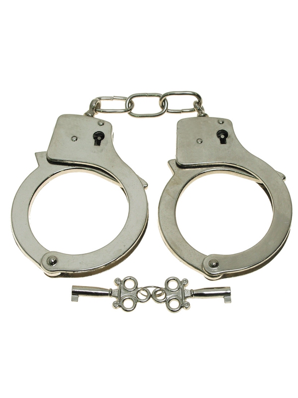 Zaklapávací pouta na obě ruce s dvěma klíči z chromované oceli. Nejedná se o profesionální pouta. | ||
