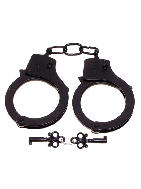 Zaklapávací pouta na obě ruce se 2 klíči z černé chromované oceli. Nejsou to profesionální pouta. | ||