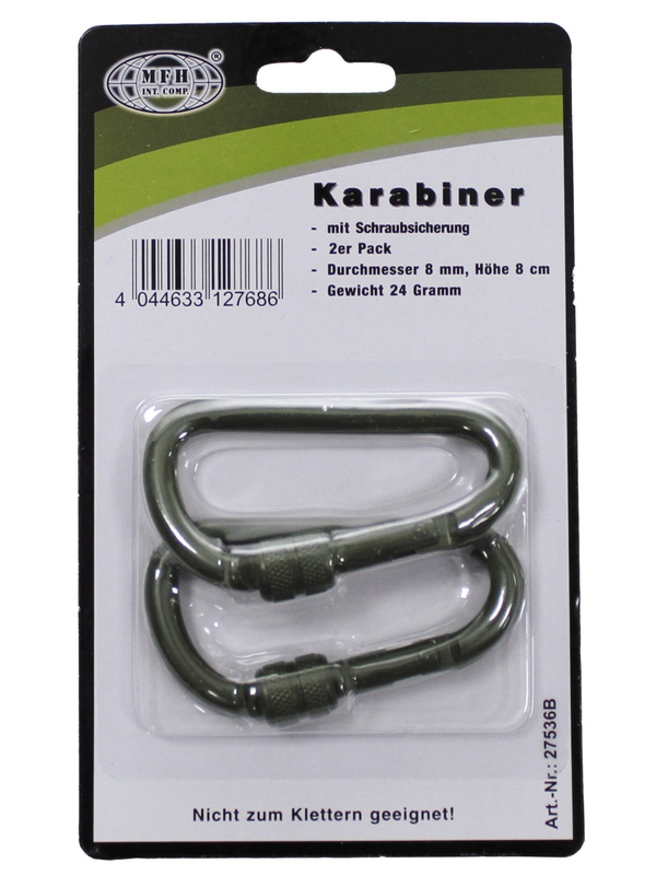 Karabina se šroubovacím uzávěrem, 8mmx8cm, 2 ks, olivový, není vhodná pro lezení a při záchranných operacích. | ||