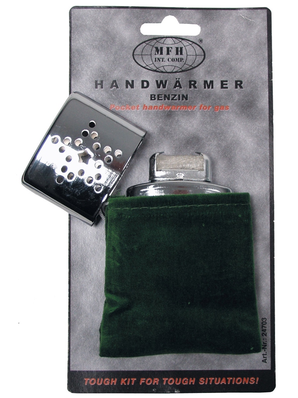 Benzínový ruční ohřívač v sametovém olivovém pouzdře se hodí do kapsy. Funguje na principu vytěsnění tepla při bezplamenném okysličování benzínových par. Nemělo by se s ním manipulovat v uzavřených prostorách, protože by došlo nakupení benzínových par. Hodí se lyžařům, vodákům, lezcům, turistům i těm, komu je občas zima. Vhodný je rovněž při nouzovém bivakování nebo pro rychlou pomoc při prochladnutí, anebo také k vyhřátí bot, spacích pytlů. Používá se i pro rozmrazování zámků aut, vodovodů apod.. Plní se technickým benzínem, objem zásobníku zhruba 20ml, vydrží přibližně 3 hodiny. Součástí je sametové olivové pouzdro. | ||