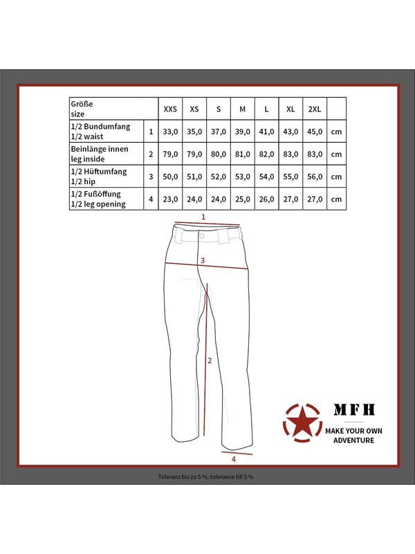 Inspirací pro tyto dámské kalhoty byly US "BDUčka". Velikost pasu lze zmenšit pomocí řemínků na bocích. Míry pro tento typ odpovídají: XXS - 32, XS - 34, S - 36, M - 38, L -40, XL - 42, XXL - 44, tedy např. S - obvod pasu cca 76 cm, délka 102 cm, M - obvod 80 cm, délka 106, L - obvod pasu 84, délka nohavic 110 cm. Materiál: 65% polyester - 35% bavlna.