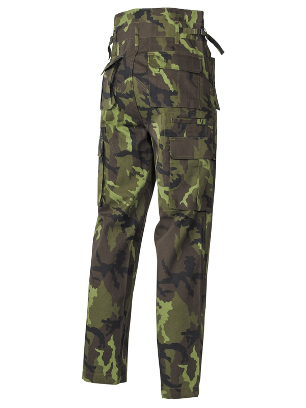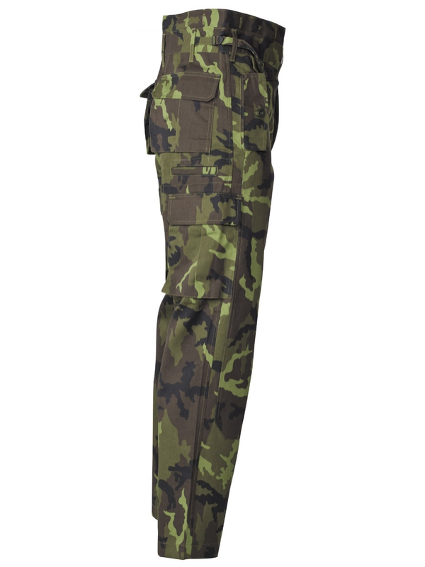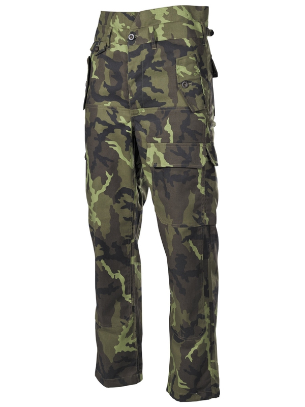 Klasické ARMY kalhoty CZ!, typ 95, dvě boční kapsy, dvě zadní s klopami, tři po stranách kladené na nohách s klopami, páskové napětí na spodku nohavic, nastavitelný pas, dvojité kolena, dvojitý zadek, zapínání na knoflíky, materiál: 65% bavlna, 35% nylon.