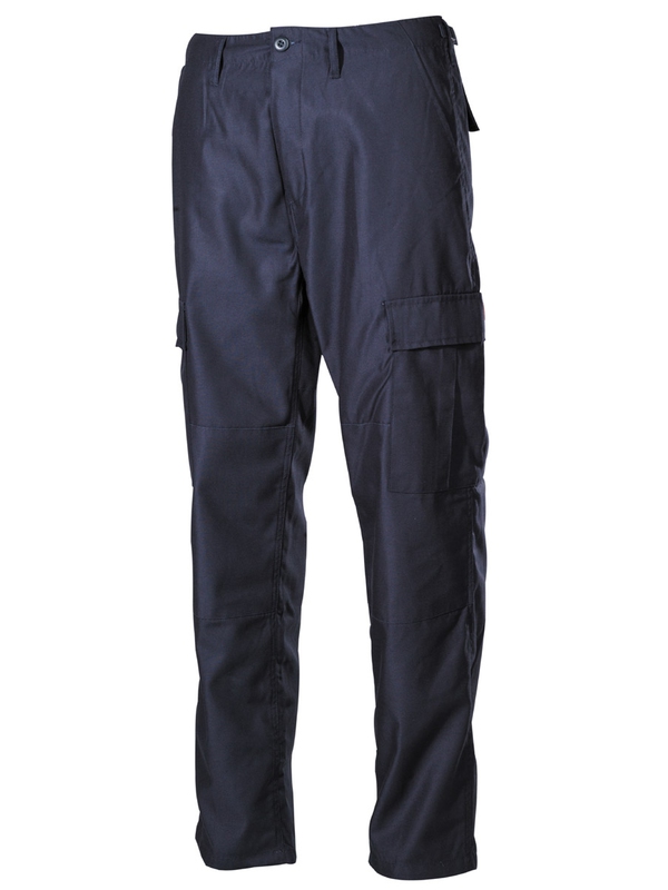 US bojové kalhoty BDU, modré s podštiými koleny a zadní částí. Klasické US ARMY kalhoty z původního materiálu v originálním designu mají dvě boční kapsy, dvě zadní s klopou a dvě boční s klopou na noze. Nohavice na utažení, nastavitelný pás, dvojitá kolena, zapínání na knoflíky, materiál: 65% polyester, 35% bavlna.