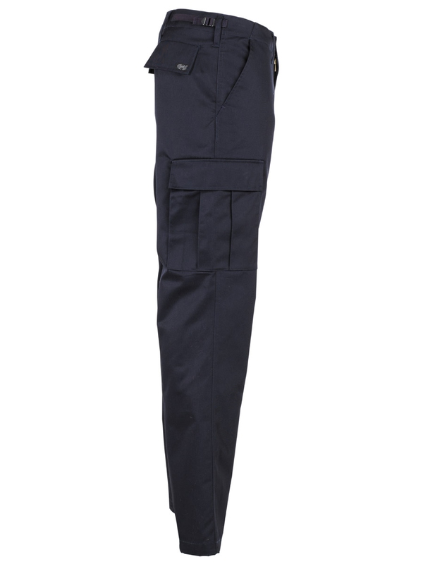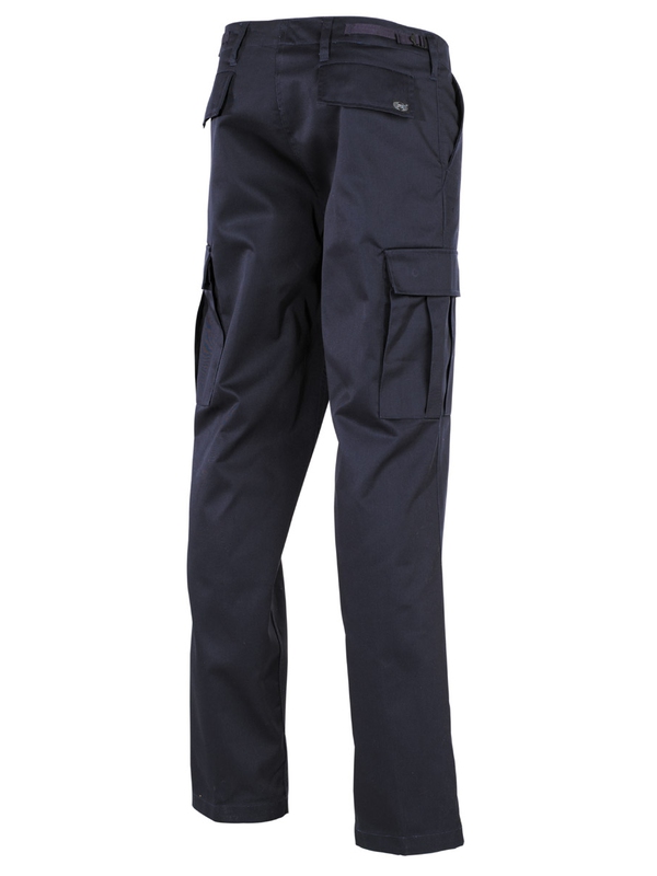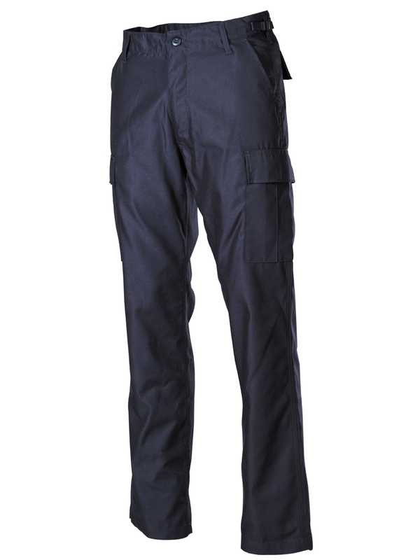 Americké bojové kalhoty, modré v moderní formě. Mají dvě boční kapsy, dvě zadní s klopou a dvě boční. kladené na noze s klopou, utahovací pásek na nohavici, nastavitelný pas se zapínáním na zip. Materiál: 65% polyester, 35% bavlna.