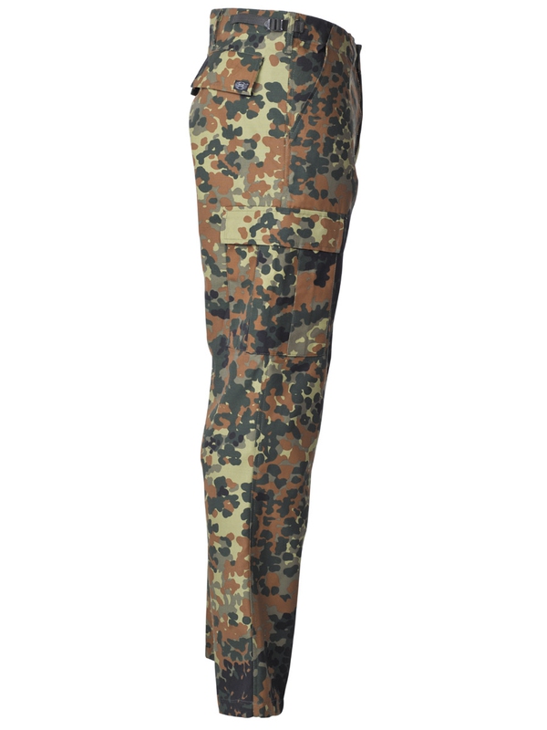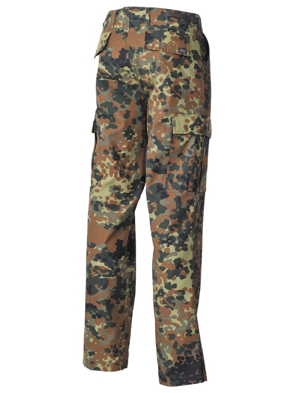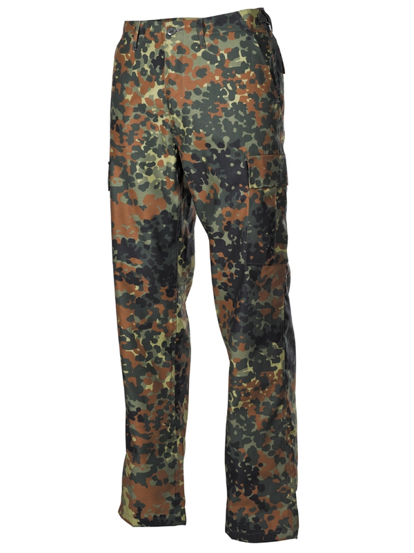 Americké bojové kalhoty, flecktarn, v moderní formě. Mají dvě boční kapsy, dvě zadní s klopou a dvě boční. kladené na noze s klopou, utahovací pásek na nohavici, nastavitelný pas se zapínáním na zip. Materiál: 65% polyester, 35% bavlna.