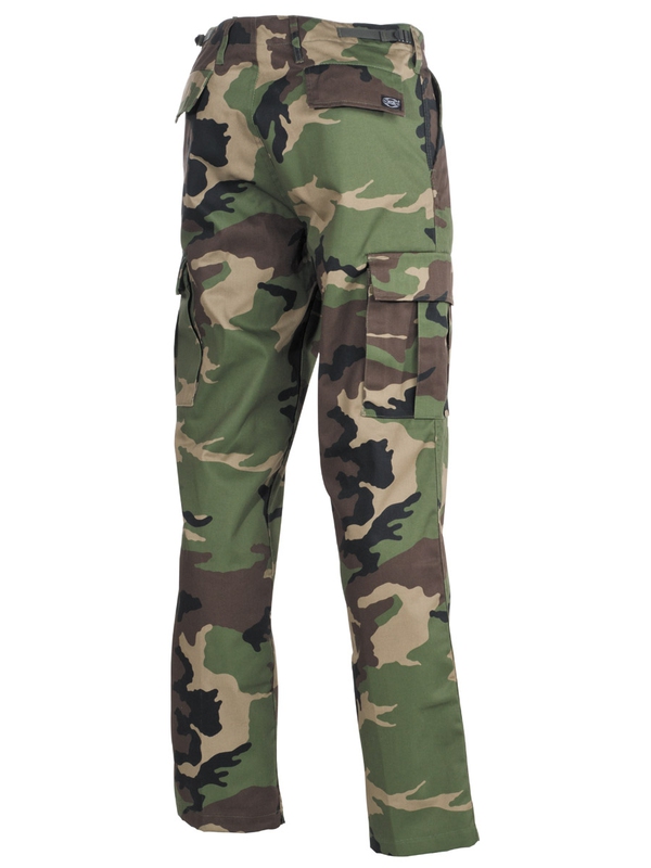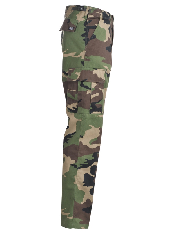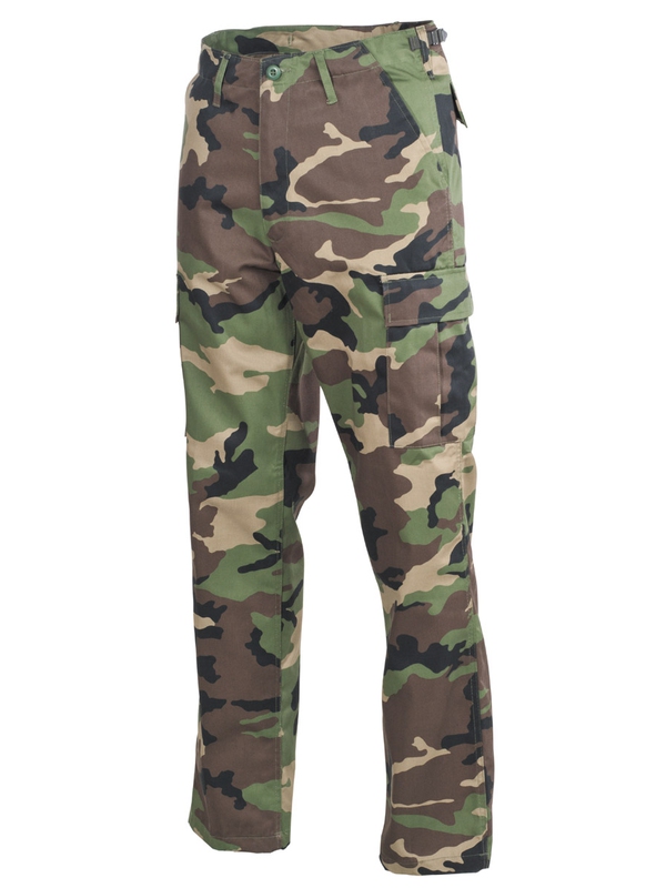 Americké bojové kalhoty, woodland, v moderní formě. Mají dvě boční kapsy, dvě zadní s klopou a dvě boční. kladené na noze s klopou, stahovací pásek na nohavici, nastavitelný pas se zapínáním na zip. Materiál: 65% polyester, 35% bavlna.