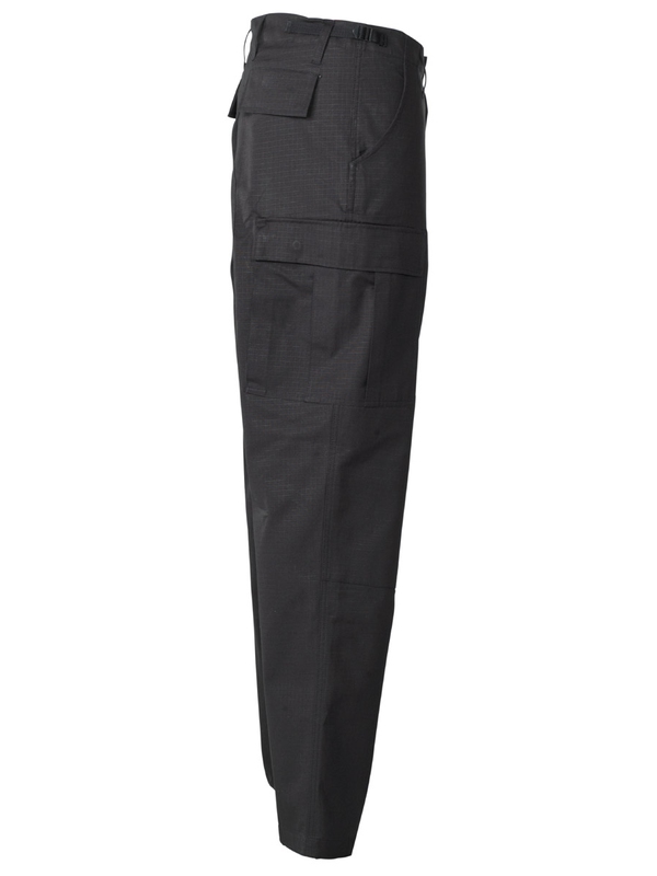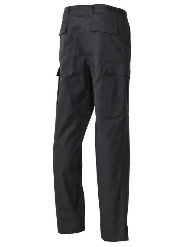 US bojové kalhoty BDU, materiál Rip Stop, černé. Klasické US ARMY kalhoty v originálním designu mají dvě boční kapsy, dvě zadní s klopou a dvě boční s klopou na noze. Nohavice na utažení, nastavitelný pás, dvojitá kolena, zapínání na knoflíky, materiál: 100% bavlna