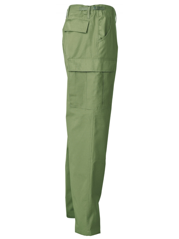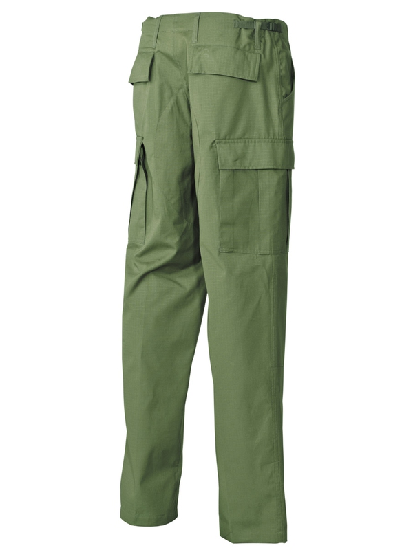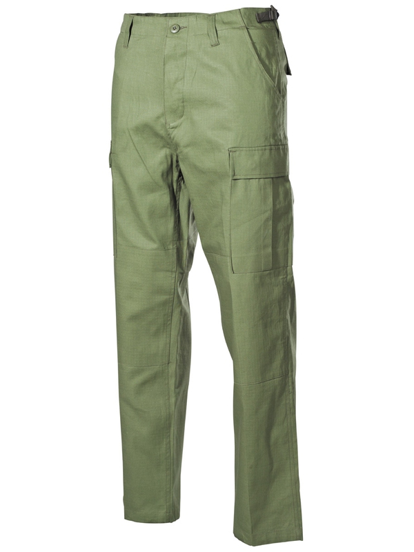 US bojové kalhoty BDU, materiál Rip Stop, olivové. Klasické US ARMY kalhoty v originálním designu mají dvě boční kapsy, dvě zadní s klopou a dvě boční s klopou na noze. Nohavice na utažení, nastavitelný pás, dvojitá kolena, zapínání na knoflíky, materiál: 100% bavlna