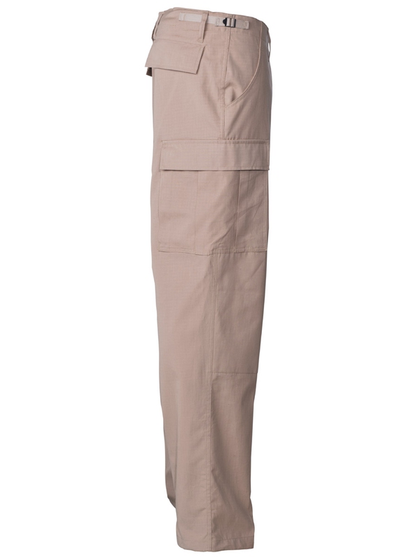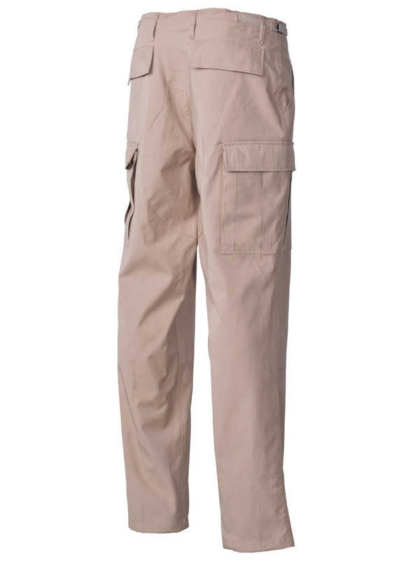 US bojové kalhoty BDU, materiál Rip Stop, khaki. Klasické US ARMY kalhoty v originálním designu mají dvě boční kapsy, dvě zadní s klopou a dvě boční s klopou na noze. Nohavice na utažení, nastavitelný pás, dvojitá kolena, zapínání na knoflíky, materiál: 100% bavlna
