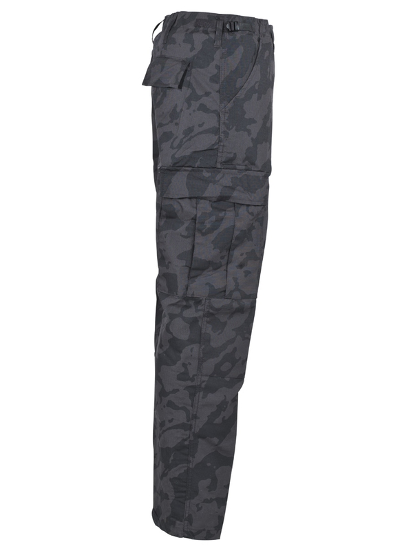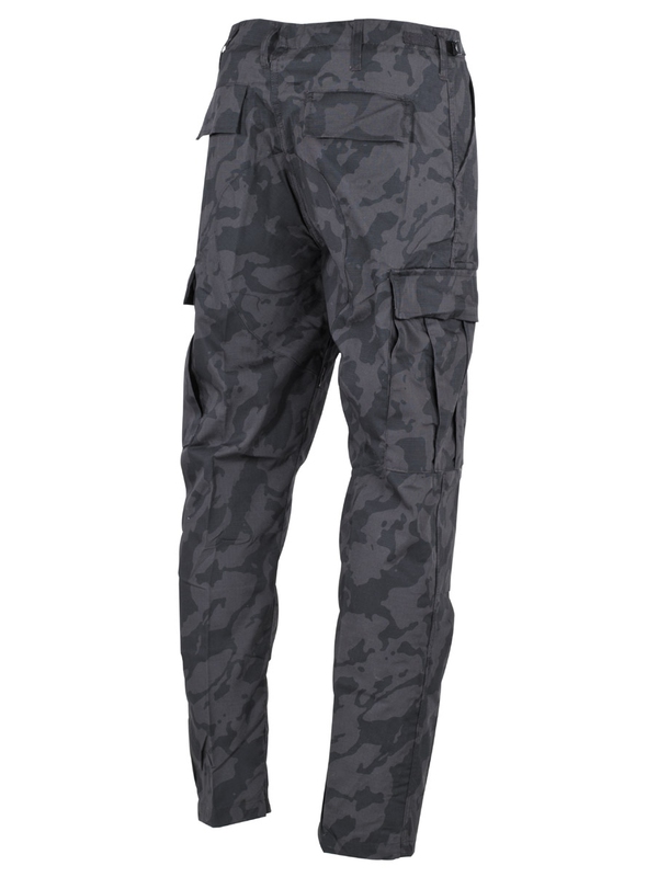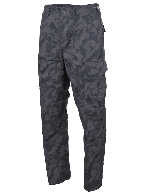 US bojové kalhoty BDU, materiál Rip Stop, černé night-camo. Klasické US ARMY kalhoty v originálním designu mají dvě boční kapsy, dvě zadní s klopou a dvě boční s klopou na noze. Nohavice na utažení, nastavitelný pás, dvojitá kolena, zapínání na knoflíky, materiál: 100% bavlna