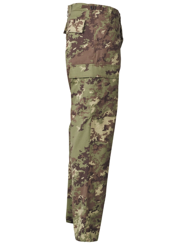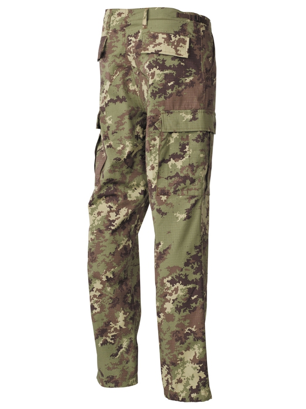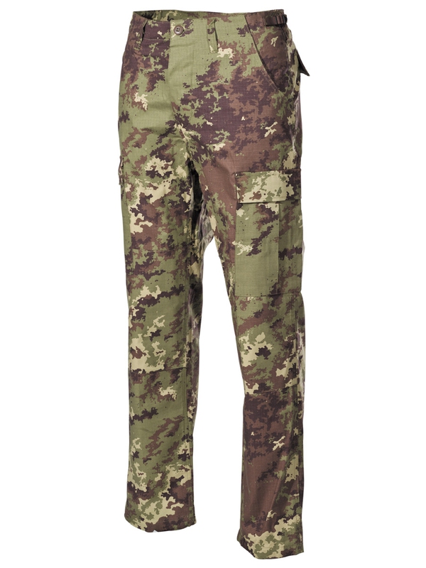 US bojové kalhoty BDU, materiál Rip Stop, vegetato. Klasické US ARMY kalhoty v originálním designu mají dvě boční kapsy, dvě zadní s klopou a dvě boční s klopou na noze. Nohavice na utažení, nastavitelný pás, dvojitá kolena, zapínání na knoflíky, materiál: 100% bavlna