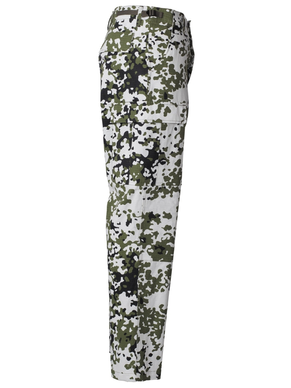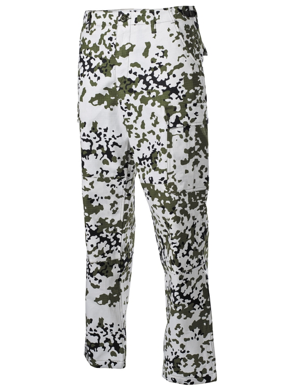Americké bojové kalhoty, flecktarn, v moderní formě. Mají dvě boční kapsy, dvě zadní s klopou a dvě boční. kladené na noze s klopou, utahovací pásek na nohavici, nastavitelný pas se zapínáním na zip. Materiál: 65% polyester, 35% bavlna.