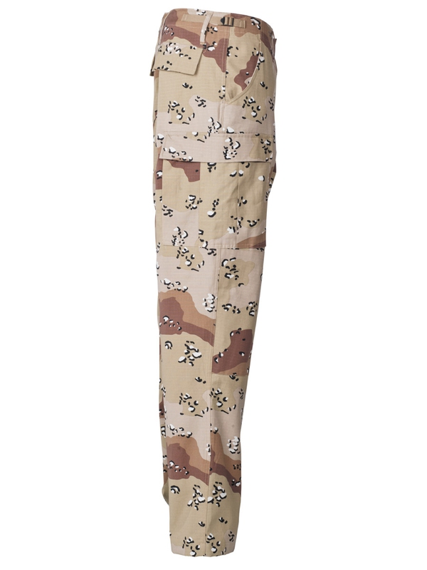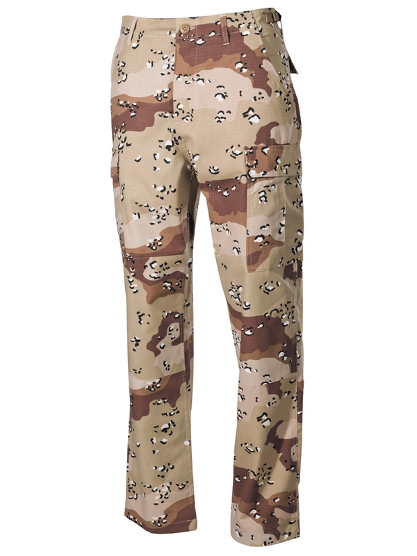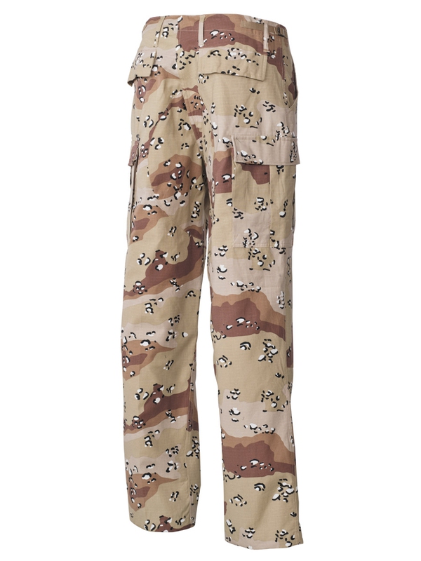 US bojové kalhoty BDU, materiál Rip Stop, 6 barev pouště. Klasické US ARMY kalhoty v originálním designu mají dvě boční kapsy, dvě zadní s klopou a dvě boční s klopou na noze. Nohavice na utažení, nastavitelný pás, dvojitá kolena, zapínání na knoflíky, materiál: 100% bavlna