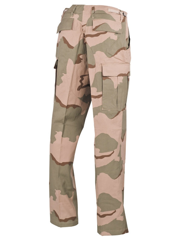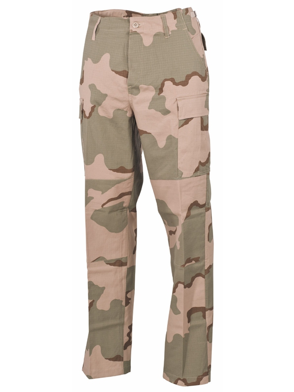 US bojové kalhoty BDU, materiál Rip Stop, 3 barvy pouště. Klasické US ARMY kalhoty v originálním designu mají dvě boční kapsy, dvě zadní s klopou a dvě boční s klopou na noze. Nohavice na utažení, nastavitelný pás, dvojitá kolena, zapínání na knoflíky, materiál: 100% bavlna