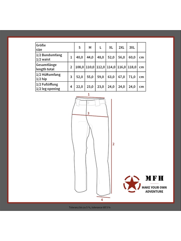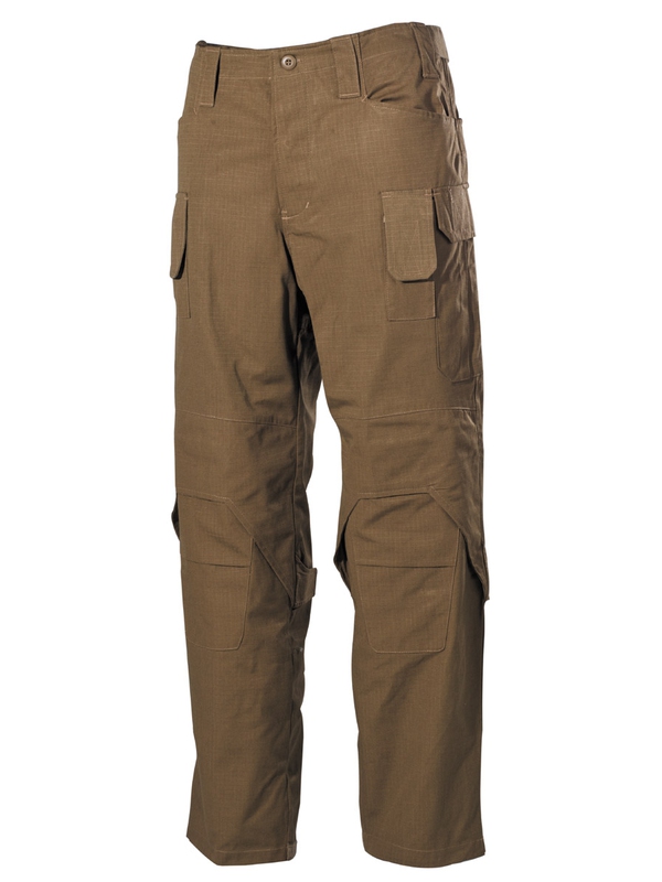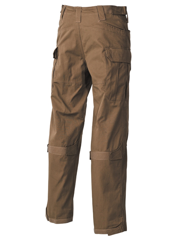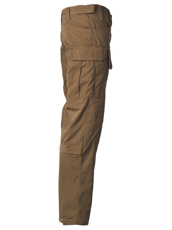 Maskáčové kalhoty Mise, maskování coyte tan, kalhoty mají dvě boční a dvě zadní kapsy, dvě boční na nohou s klopou a dvě malé našité stehenní lamelové kapsy, mají vyztuženou sedací část, zesílená kolena s kapsami na chrániče (27691A), nastavitelný pas, nastavení šířky lýtek a kotníků na nohavicích se suchým zipem, zapínání na knoflíky, materiál 65% bavlna, 35% nylon.
