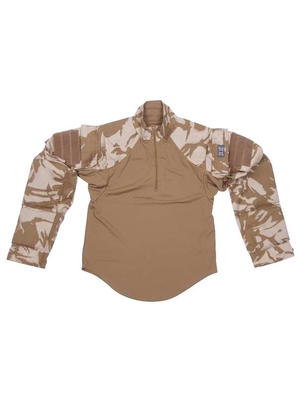 Britská bojová košile, DP desert, má kapsu na rukávu s uzávěrem na suchý zip, nastavitelné manžety u rukávů, šité chrániče na lokti, ramenou a předloktí, je ideální pro nošení pod vestou. Design pouštní kamufláž, material: bavlna a polyester.