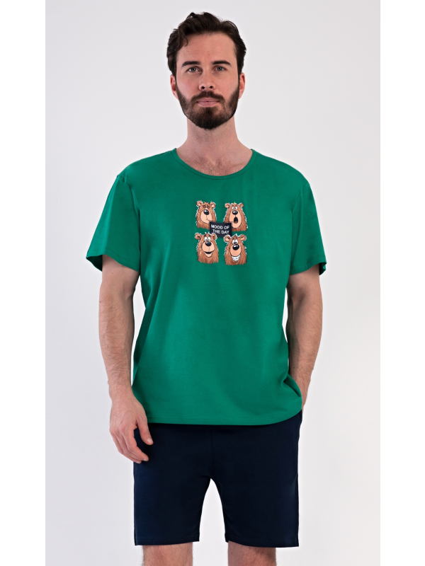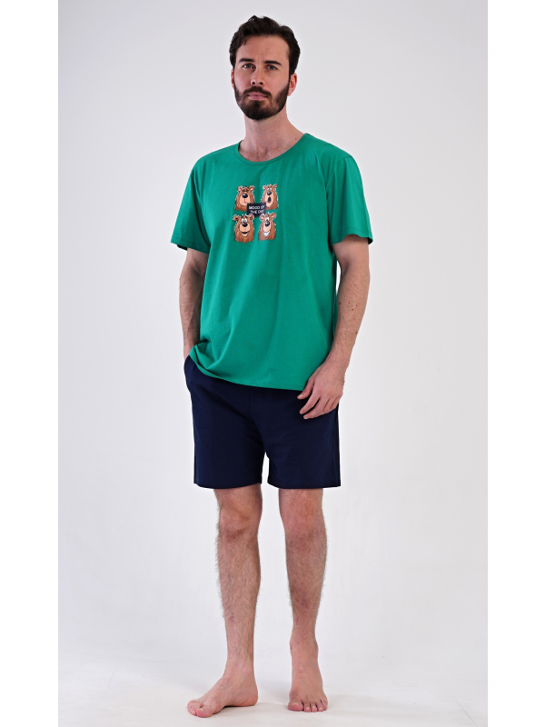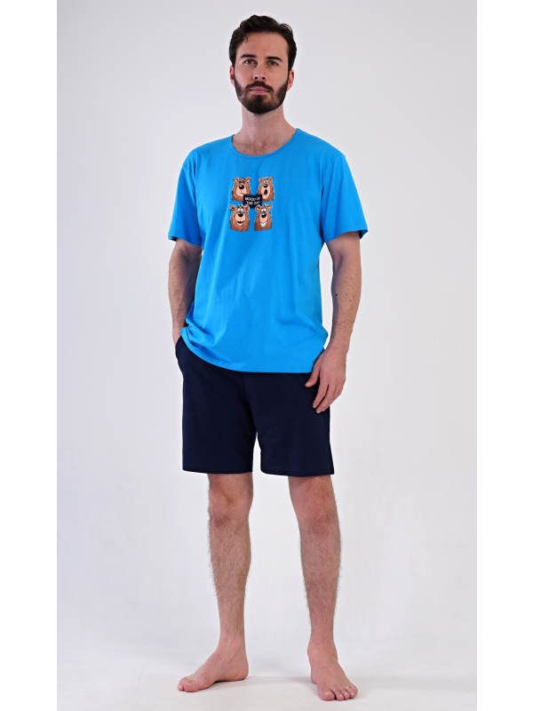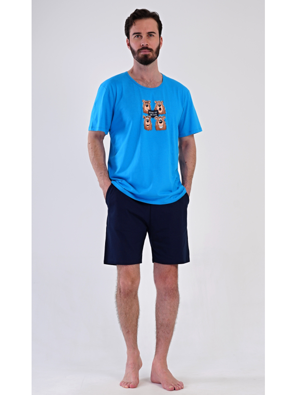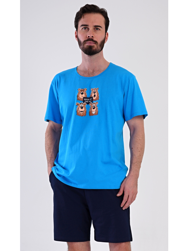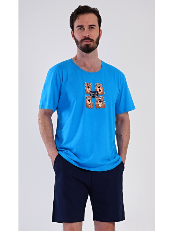 Pánské šortkové pyžamo Méďa Happy. Pánské bavlněné šortkové pyžamo Méďa Happy. Pánské pyžamo se skládá z trička s krátkým rukávem a krátkých šortkových kalhot. Na jednobarevném tričku je obrázek medvěda, jehož výraz se mění v průběhu (pracovního) dne. Šortky mají praktické kapsy, v pase gumu a šňůrku na stáhnutí. Použitý materiál s podílem bavlny 100% je příjemný a poddaný na dotek. Pyžamo je vhodné i na denní nošení a oceníte ho obzvlášť v horkých letních dnech. Pokyny pro údržbu: - 100% bavlna