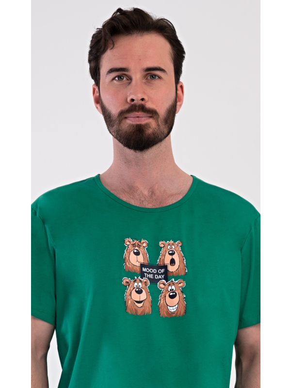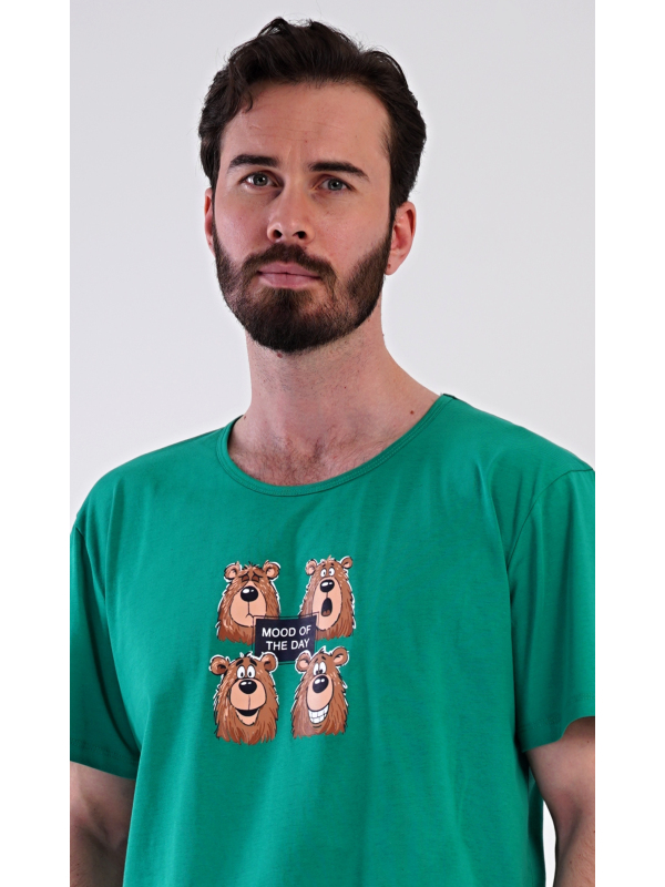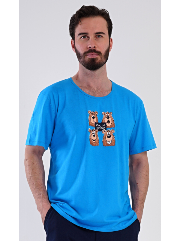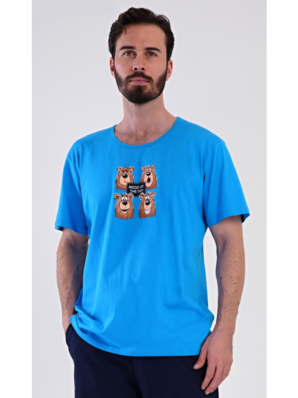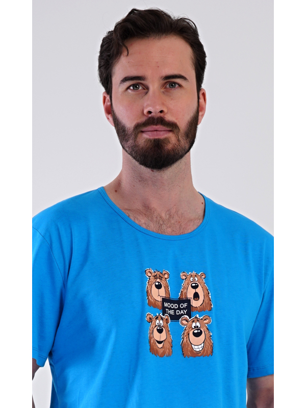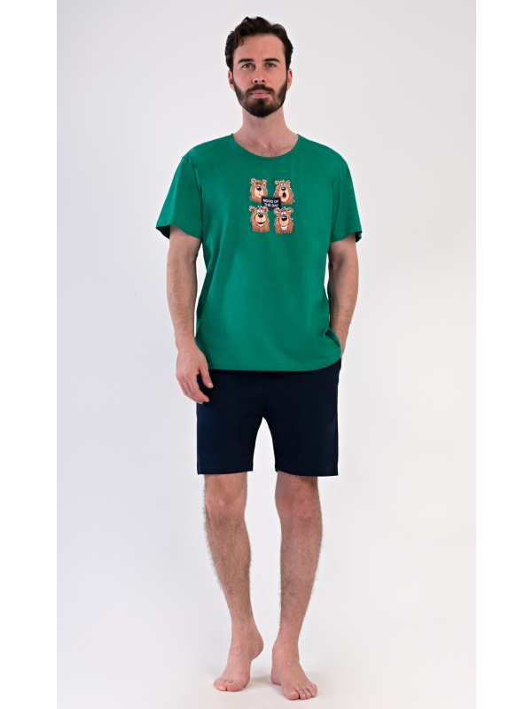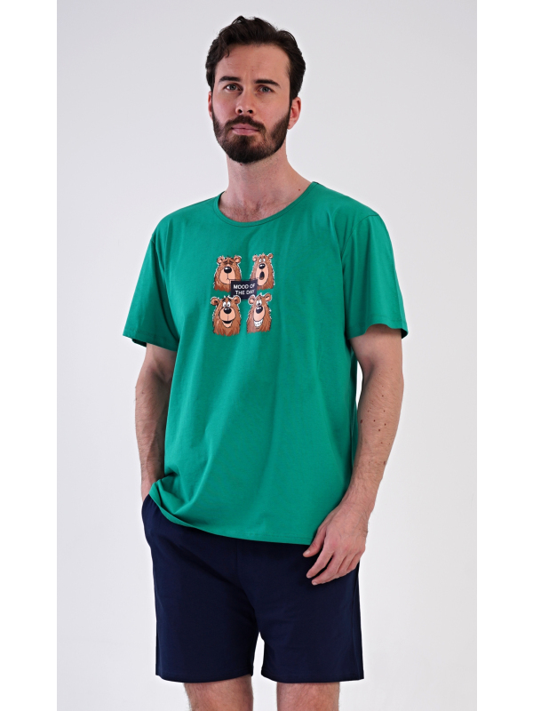 Pánské šortkové pyžamo Méďa Happy. Pánské bavlněné šortkové pyžamo Méďa Happy. Pánské pyžamo se skládá z trička s krátkým rukávem a krátkých šortkových kalhot. Na jednobarevném tričku je obrázek medvěda, jehož výraz se mění v průběhu (pracovního) dne. Šortky mají praktické kapsy, v pase gumu a šňůrku na stáhnutí. Použitý materiál s podílem bavlny 100% je příjemný a poddaný na dotek. Pyžamo je vhodné i na denní nošení a oceníte ho obzvlášť v horkých letních dnech. Pokyny pro údržbu: - 100% bavlna