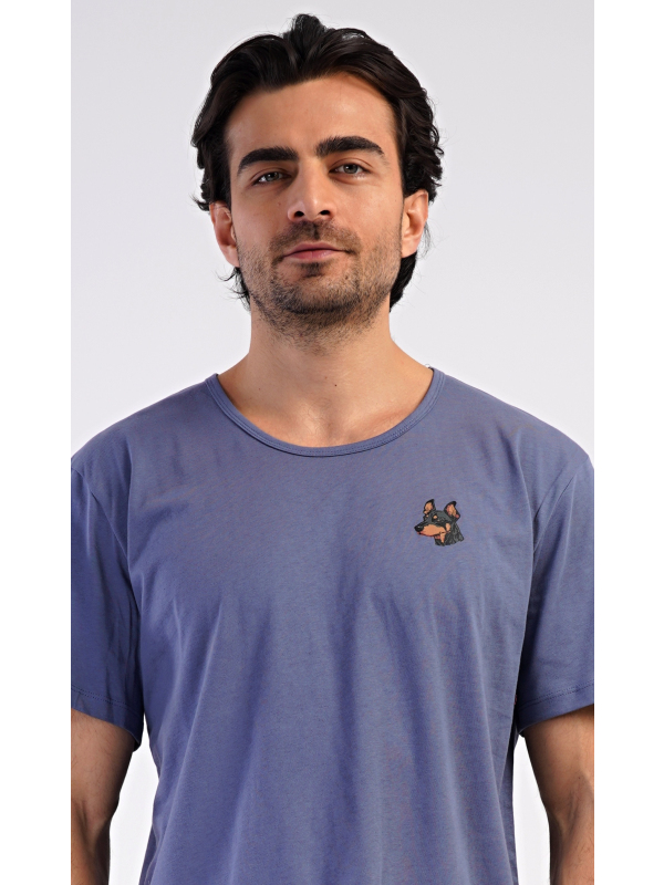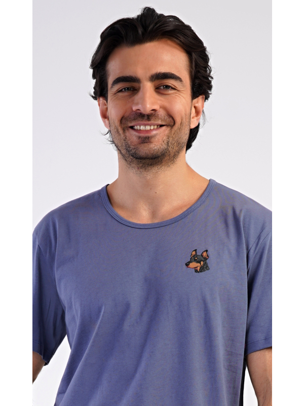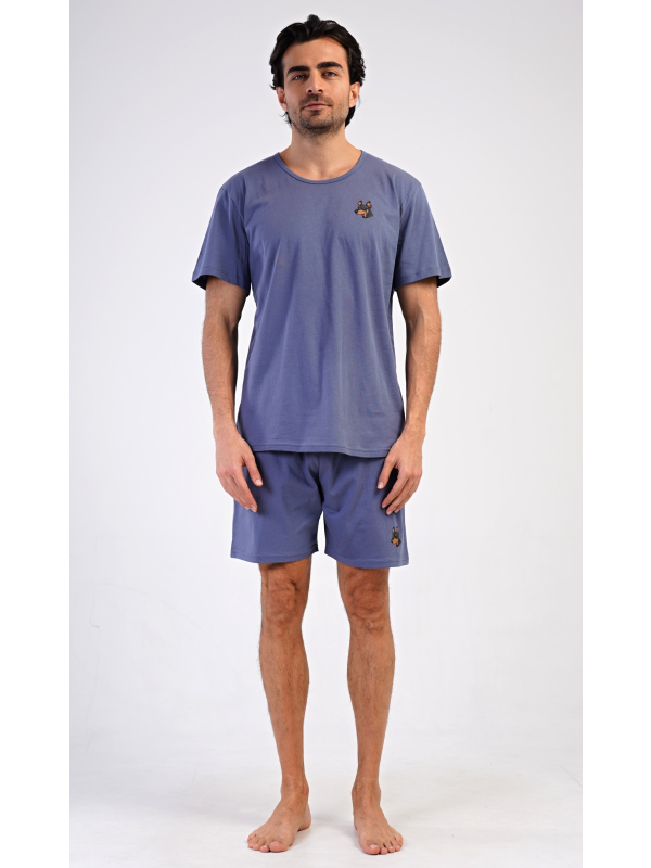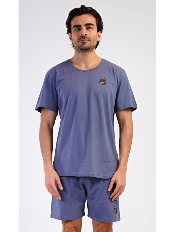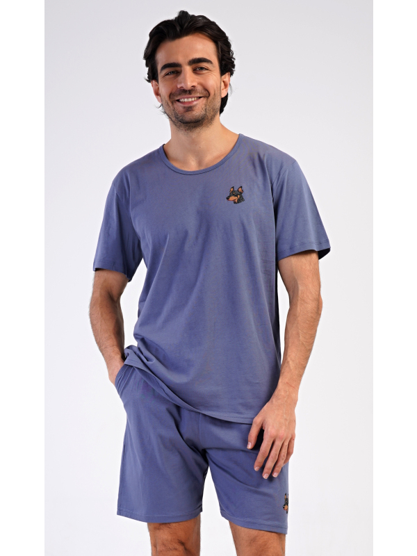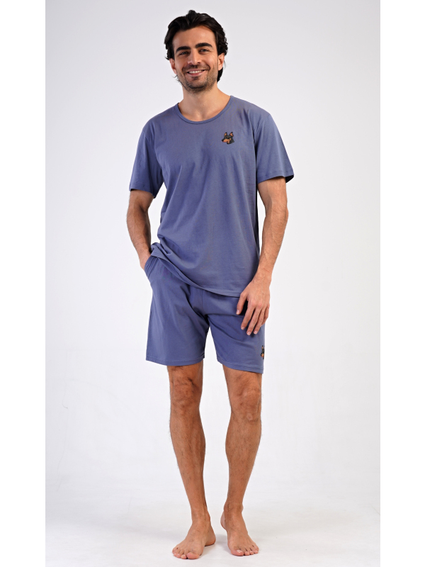 Pánské bavlněné šortkové pyžamo Pes. Pánské pyžamo se skládá z trička s krátkým rukávem a krátkých šortkových kalhot. Na jednobarevném tričku je obrázek psa, tento obrázek se opakuje i na šortkách, které mají praktické kapsy, v pase gumu a šňůrku na stáhnutí. Použitý materiál s podílem bavlny 100% je příjemný a poddaný na dotek. Pyžamo oceníte obzvlášť v horkých letních dnech.