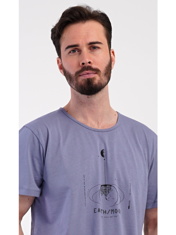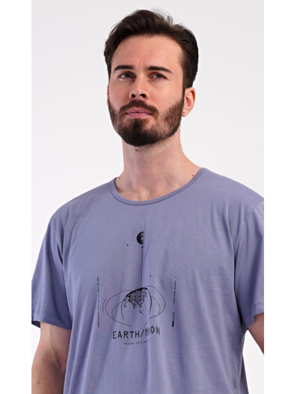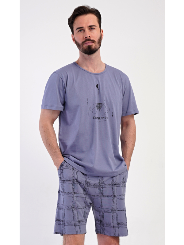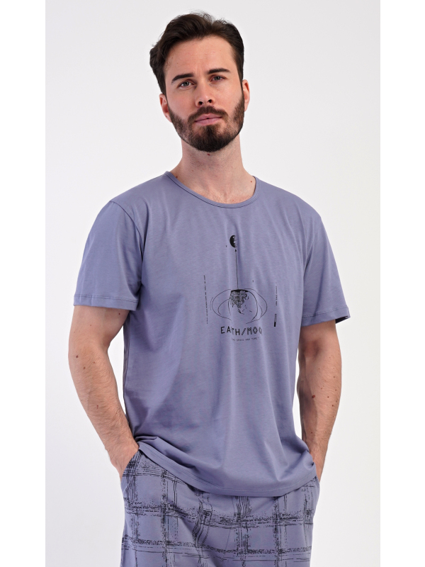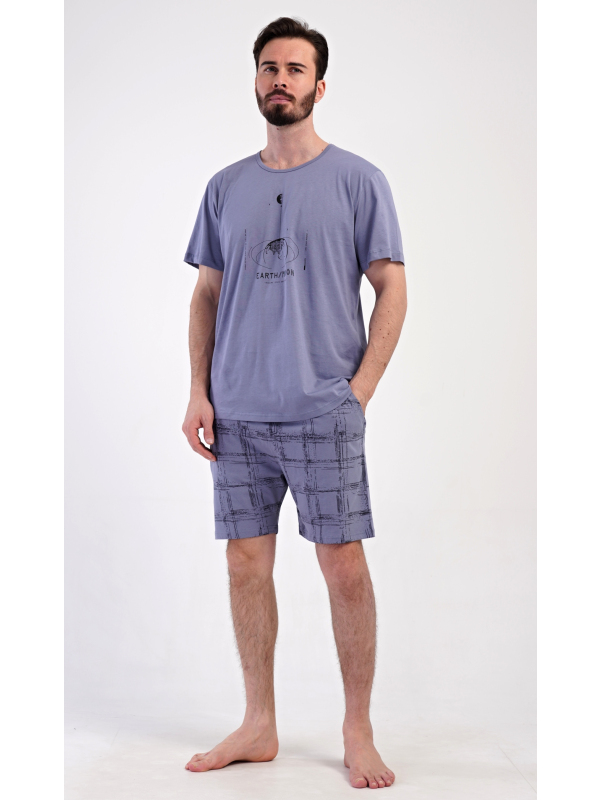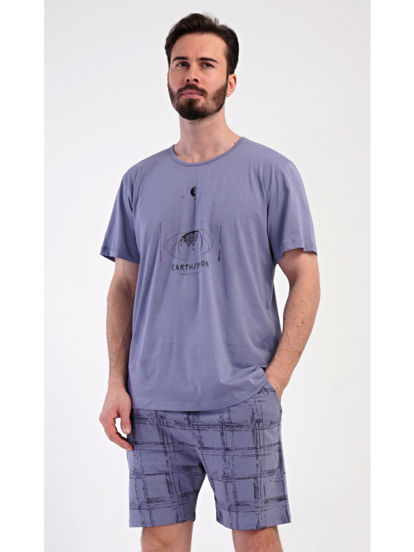 Pánské bavlněné šortkové pyžamo Earth. Pánské bavlněné šortkové pyžamo Earth. Pánské pyžamo se skládá z trička s krátkým rukávem a krátkých šortkových kalhot. Jednobarevné tričko má kulatý výstřih a zdobí ho na hrudi obrázek s motivem vesmíru. Tričko doplňují kárované šortky, které mají v pase gumu, šňůrku na stažení a praktické kapsy. Použitý materiál s obsahem bavlny 100% je příjemný a poddajný na dotek. Pokyny pro údržbu: - 100% bavlna Míry naměřené na výrobku: