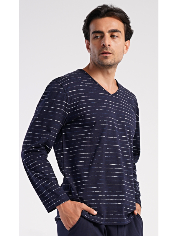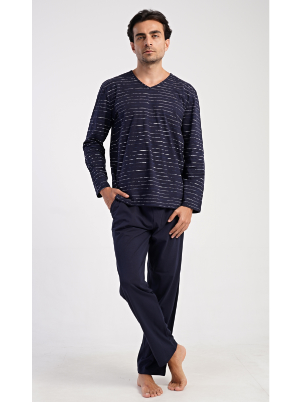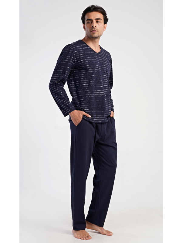 Pánské dlouhé bavlněné pyžamo Bart. Pánské pyžamo se skládá z trika s dlouhým rukávem a dlouhých kalhot. Triko s výstřihem do V zdobí nepravidelné proužky. Jednobarevné kalhoty mají v pase gumu, šňůrku na stažení a praktické kapsy. Použitý materiál s obsahem bavlny 100% je poddajný a příjemný na dotek.