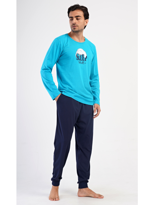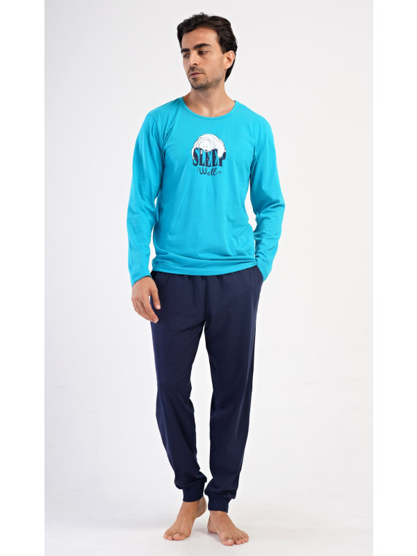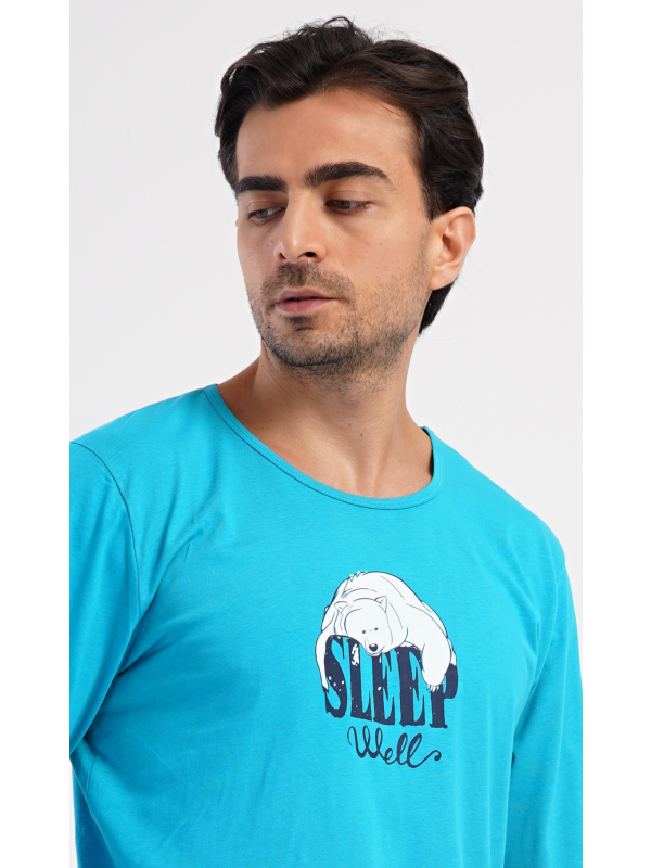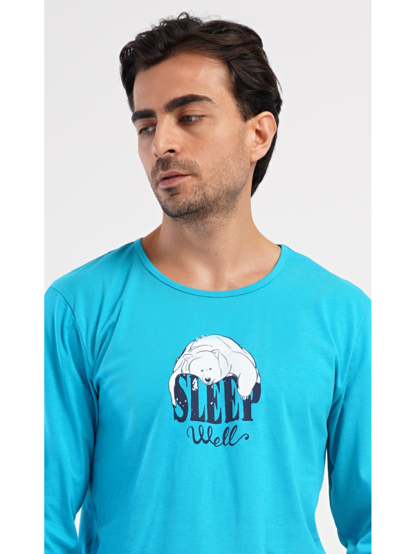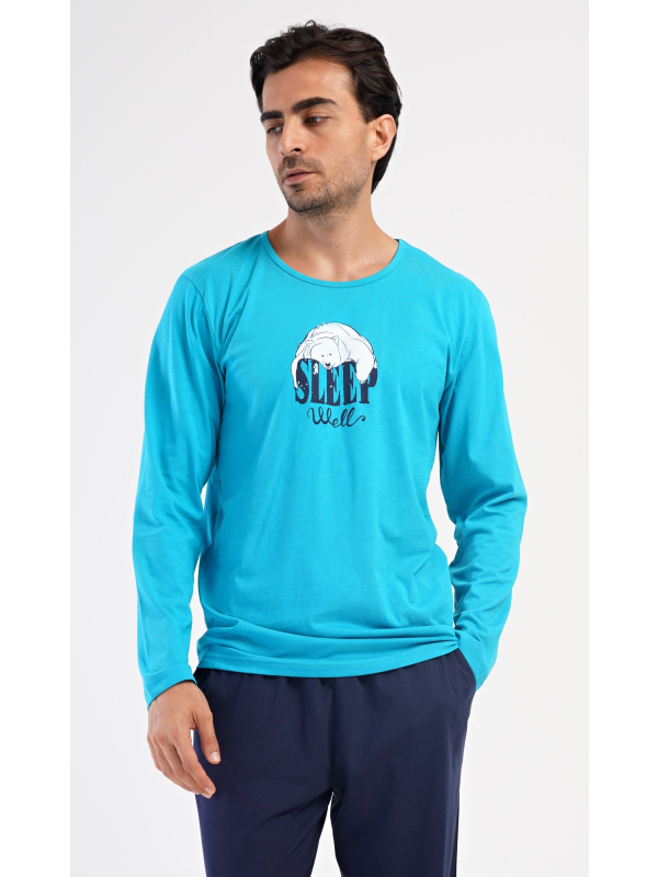 Pánské bavlněné pyžamo s dlouhým rukávem Sleep. Pánské dlouhé bavlněné pyžamo Sleep. Pánské pyžamo se skládá z trika s dlouhým rukávem a dlouhých kalhot, které jsou zakončeny lemy. Triko s kulatým výstřihem zdobí na hrudi obrázek ledního medvěda a nápis SLEEP WELL. Jednobarevné kalhoty mají v pase gumu, šňůrku na stažení a praktické kapsy. Použitý materiál s obsahem bavlny 100% je poddajný a příjemný na dotek. Pokyny pro údržbu: - 100% bavlna Míry naměřené na výrobku: