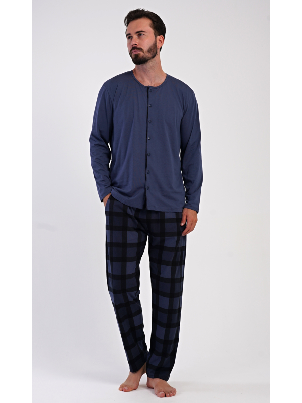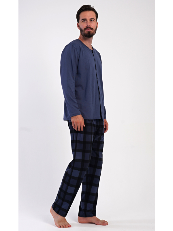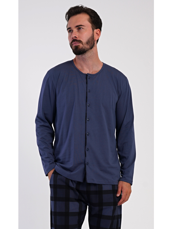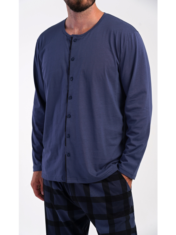 Pánské bavlněné pyžamo s dlouhým rukávem Rudolf. Pánské dlouhé bavlněné pyžamo Rudolf. Pánské pyžamo se skládá z trika s dlouhým rukávem a dlouhých kalhot. Triko s kulatým výstřihem má zapínání na knoflíky. Kárované kalhoty mají v pase gumu, šňůrku na stažení a praktické kapsy. Použitý materiál s obsahem bavlny 100% je poddajný a příjemný na dotek. Pokyny pro údržbu: - 100% bavlna Míry naměřené na výrobku: