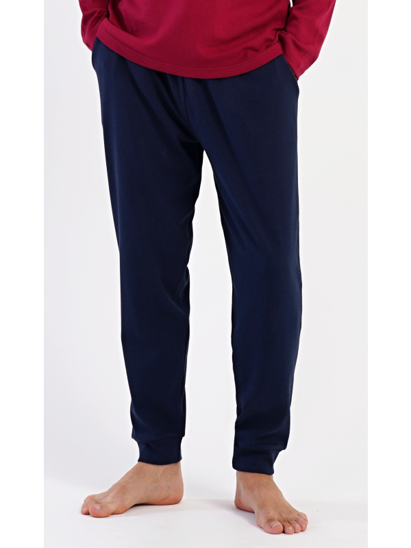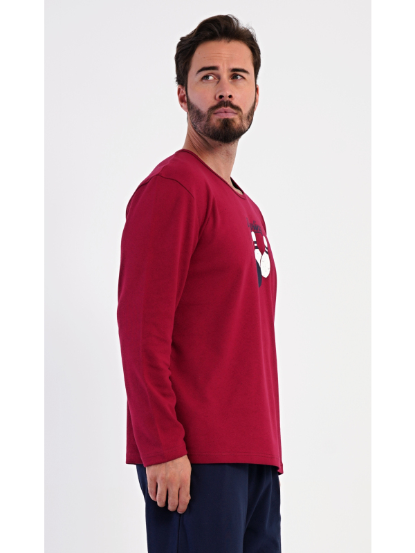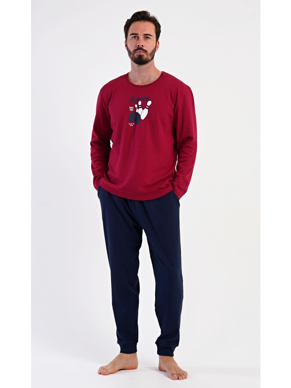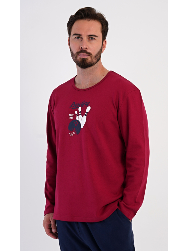 Pánské bavlněné pyžamo s dlouhým rukávem Bowling. Pánské dlouhé bavlněné pyžamo Bowling. Pánské pyžamo se skládá z trika s dlouhým rukávem a dlouhých kalhot zakončených lemy. Triko s kulatým výstřihem zdobí na hrudi obrázek kuželek a nápis BOWLING. Jednobarevné kalhoty mají v pase gumu, šňůrku na stažení a praktické kapsy. Použitý materiál INTERLOK s obsahem bavlny 100% je poddajný a příjemný na dotek. Pokyny pro údržbu: - 100% bavlna Míry naměřené na výrobku: