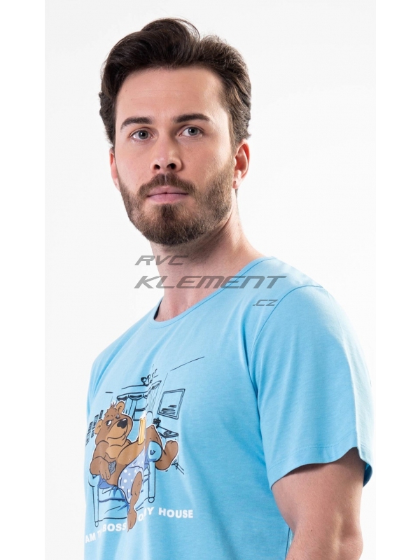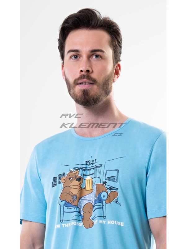 Pánské bavlněné pyžamo šortky Boss. Pánské pyžamo se skládá z trička s krátkým rukávem a krátkých šortkových kalhot. Na jednobarevném tričku s kulatým výstřihem je obrázek medvěda odpočívajícího v křesle a nápis ’Im the Boss of my House’. Tričko doplňují jednobarevné šortky, které mají v pase gumu a šňůrku ke stažení. Nemají kapsy. Použitý materiál je příjemný a poddajný na dotek. Podíl bavlny u trička a šortek je 100%. Pyžamo je vhodné i na denní nošení.