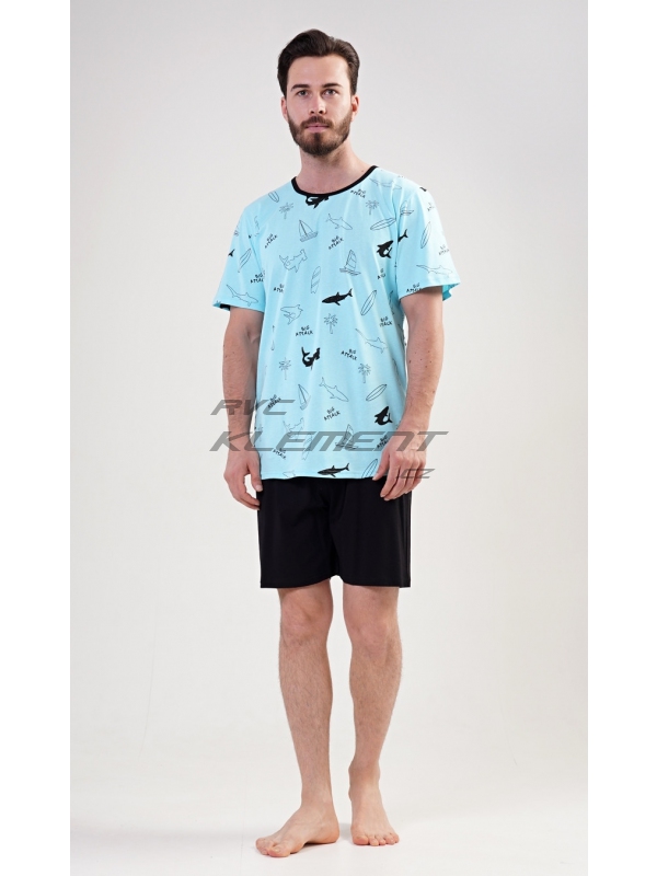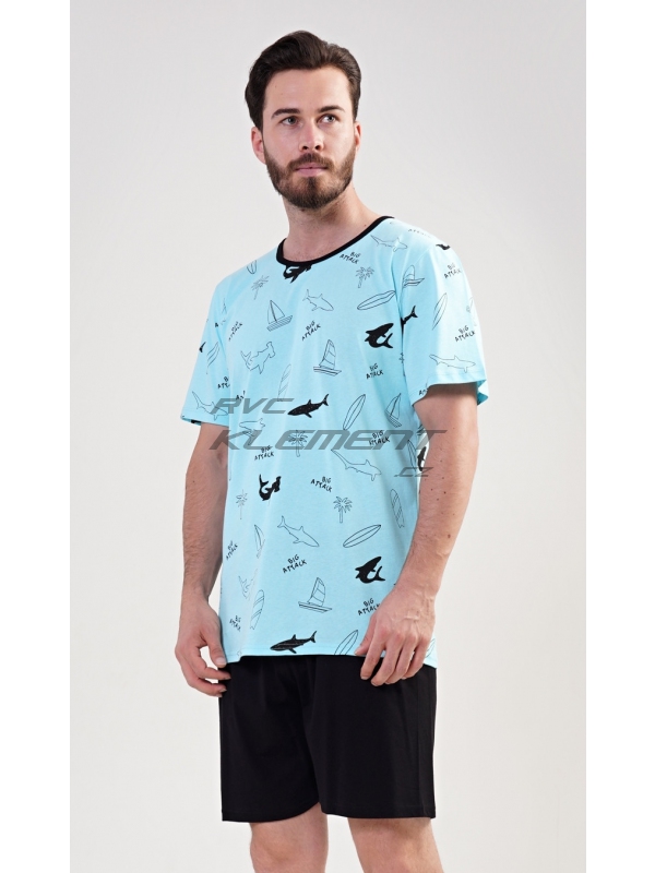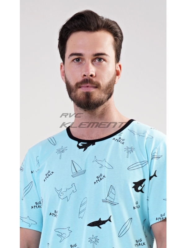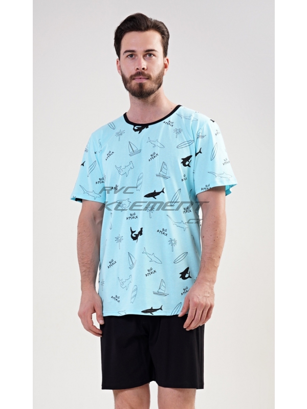 Pánské bavlněné pyžamo šortky Oceán. Pánské pyžamo šortky se skládá z trika s krátkým rukávem a krátkých šortkových kalhot. Tričko je potištěno loďkami, žraloky , palmami a nápisem Big Attack. Pestré tričko vhodně doplňují jednobarevné šortky. Šortky jsou bez kapes, mají gumu a šňůrku na stažení. Použitý materiál s podílem bavlny 100% je příjemný a poddajný na dotek. Pyžamo je vhodné i na denní nošení.