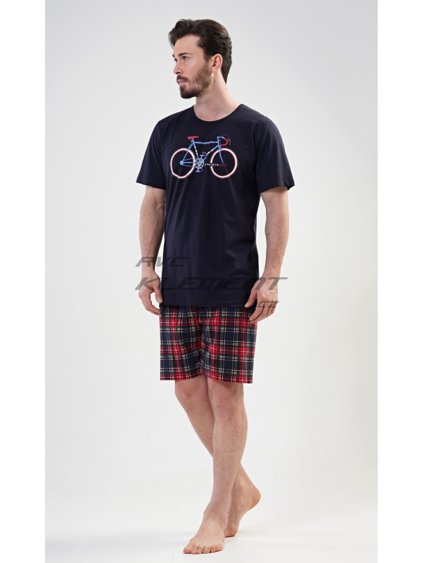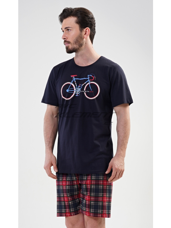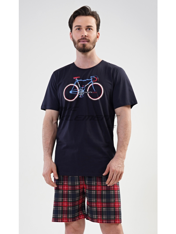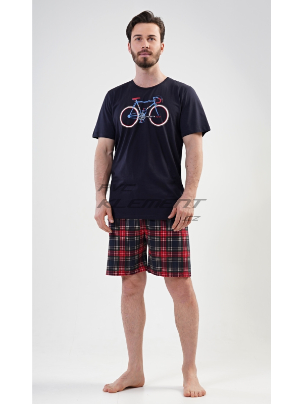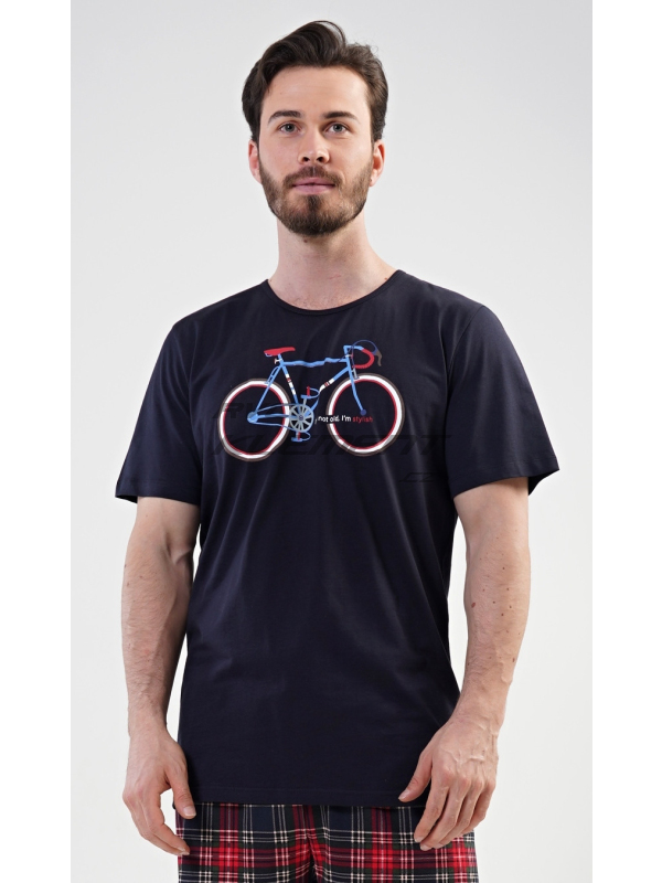 Pánské pyžamo šortky Old bike. Pánské bavlněné pyžamo šortky Old bike. Pánské pyžamo se skládá z trička s krátkým rukávem a krátkých šortkových kalhot. Na tričku je obrázek kola a nápis I´m not old, I´m stylish. Výrazné tričko vhodně doplňují kostkované kalhoty. Šortky jsou bez kapes, mají gumu a šňůrku na stažení. Použitý materiál s podílem bavlny 100% je příjemný a poddajný na dotek. Pyžamo je vhodné i na denní nošení. Pokyny pro údržbu: - 100% bavlna Míry naměřené na výrobku: