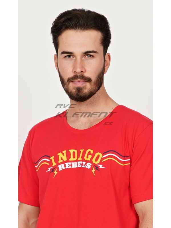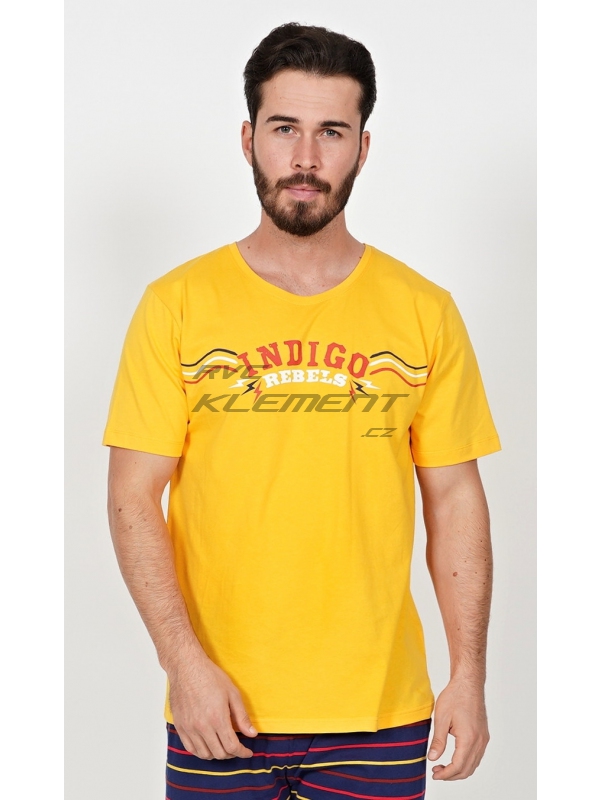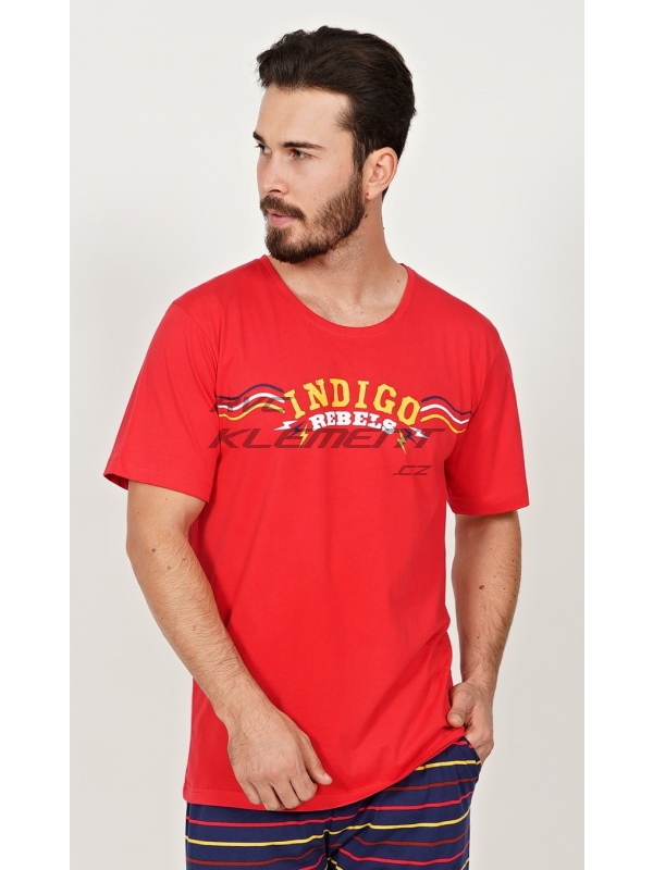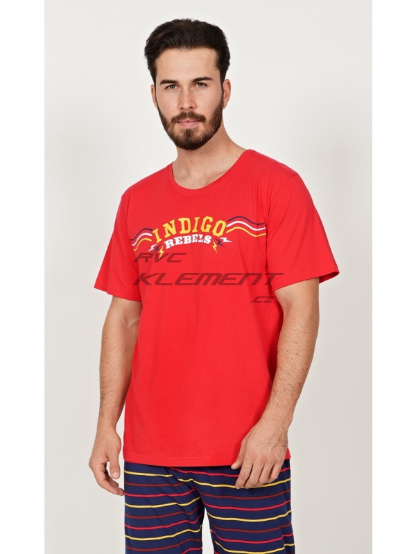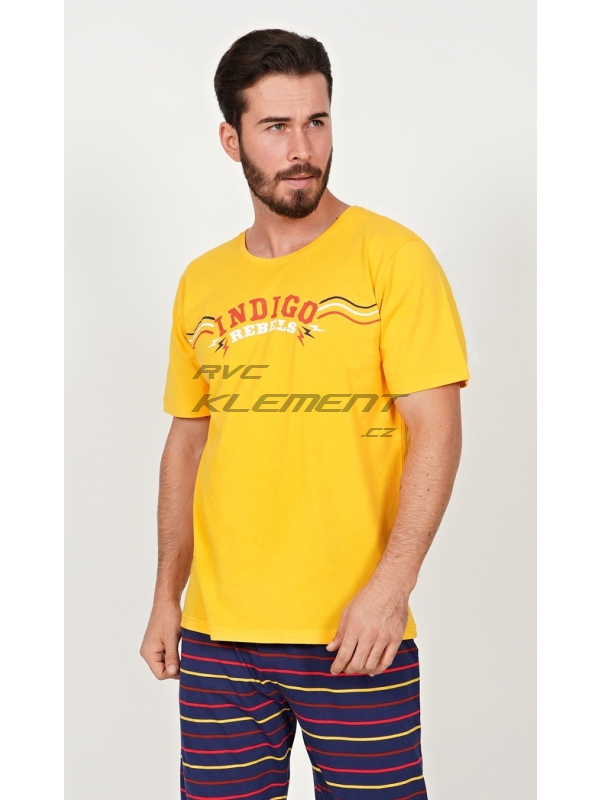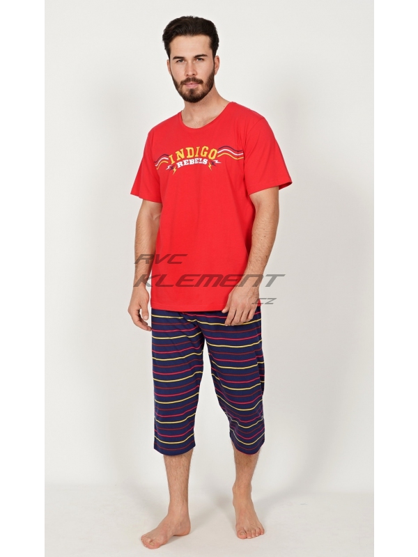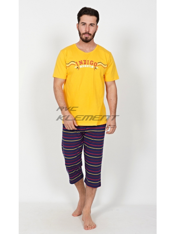 Pánské kapri pyžamo Indigo. Pánské bavlněné kapri pyžamo Indigo. Pánské pyžamo se skládá z trička s krátkým rukávem a tříčtvrtečních kalhot. Na jednobarevném tričku je nápis ’Indigo rebels’. Tričko vhodně doplňují jednobarevné kalhoty pod kolena, které mají v pase gumu, šňůrku na stažení a praktické kapsy. Použitý materál s obsahem bavlny 100% je příjemný a poddajný na dotek. Pokyny pro údržbu: - 100% bavlna