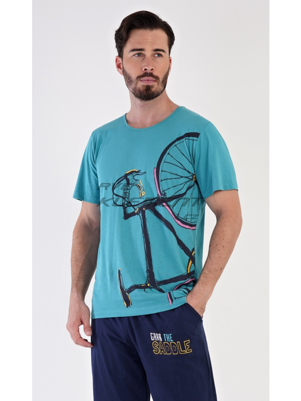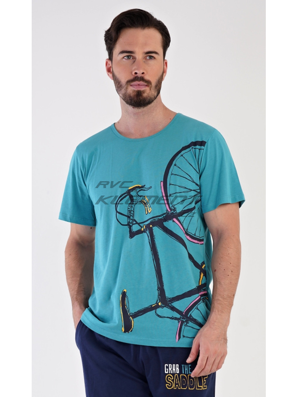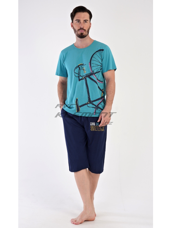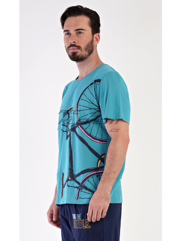 Pánské bavlněné pyžamo bermudy Dominik. Pánské pyžamo se skládá z trička s krátkým rukávem a kalhot po kolena. Jednobarevné triko zdobí výrazný obrázek kola. Kalhoty mají v pase gumu, šňůrku na stažení a praktické kapsy. Použitý materiál je jemný a poddajný na dotek. Podíl bavlny u trika a kalhot je 100%.