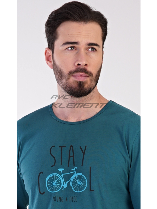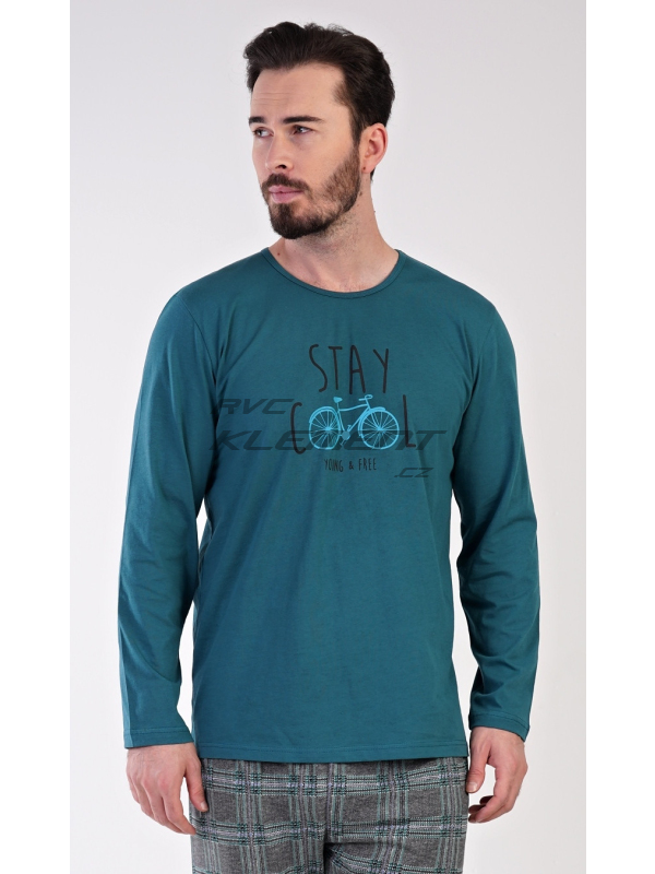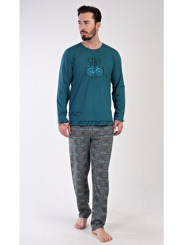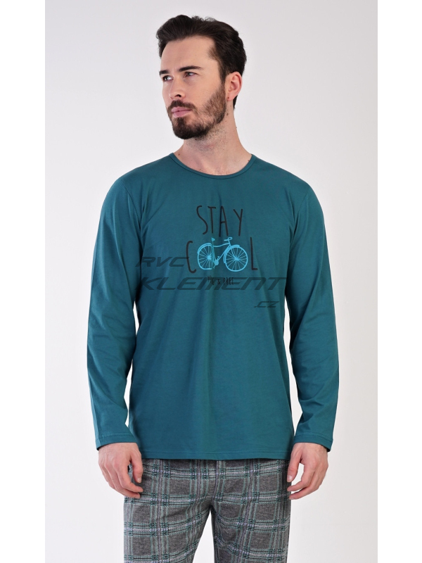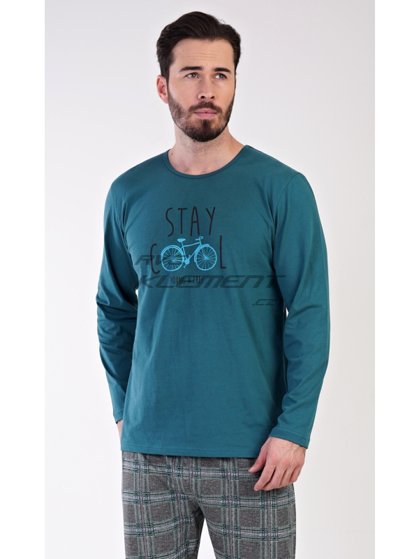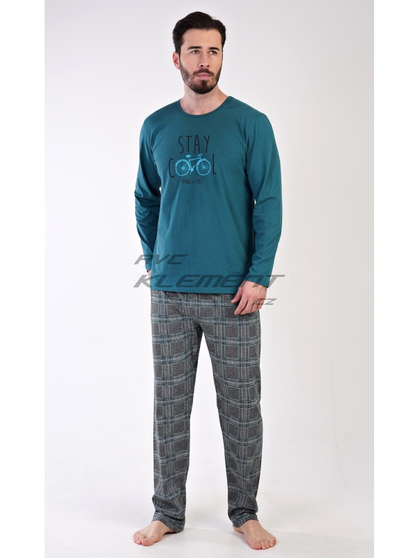 Pánské bavlněné pyžamo dlouhé Adam. Pánské pyžamo se skládá z trika s dlouhým rukávem a dlouhých kalhot. Jednobarevné triko s kulatým výstřihem je zdobeno obrázkem kola a nápisem ’Stay cool, young and free’. Kostkované kalhoty mají v pase gumu a šňůrku na stažení. Nemají kapsy. Použitý materiál je příjemný a poddajný na dotek. Podíl bavlny u kalhot i trika je 100%.