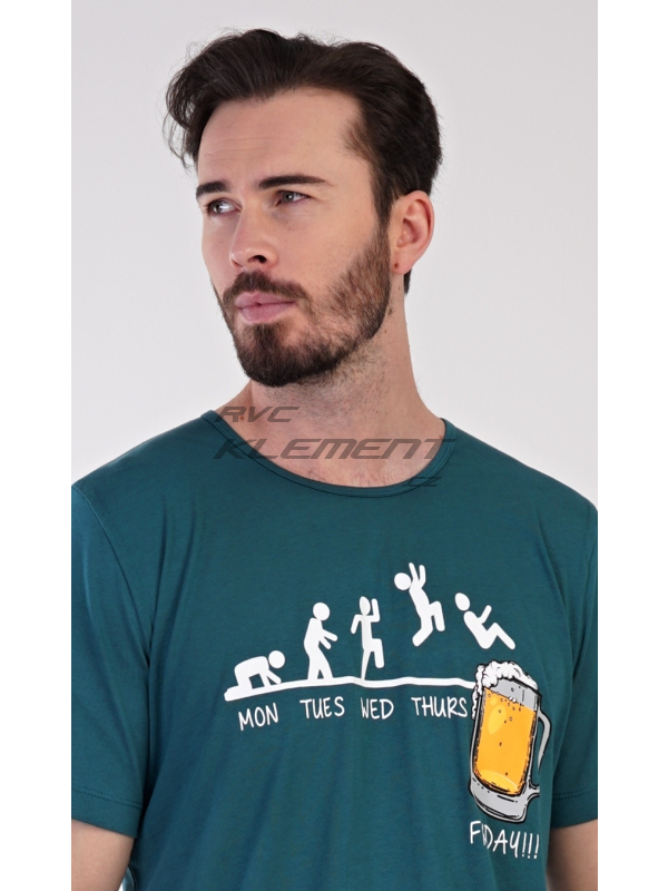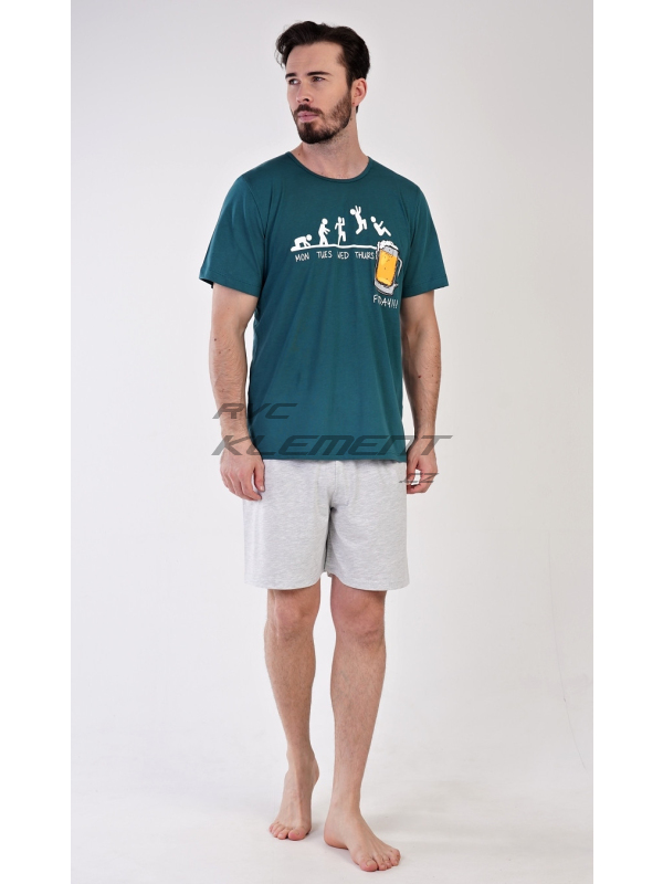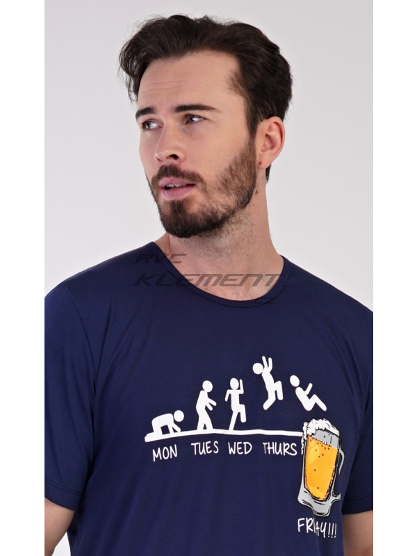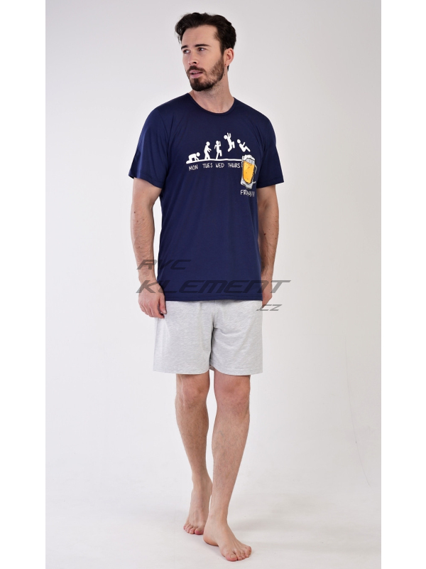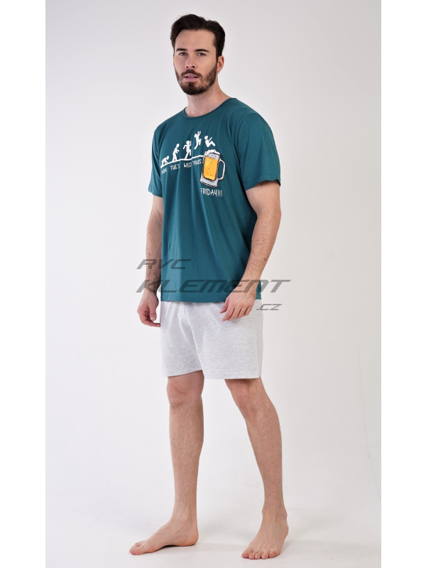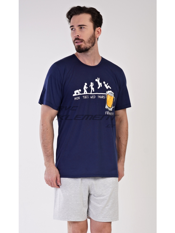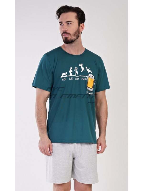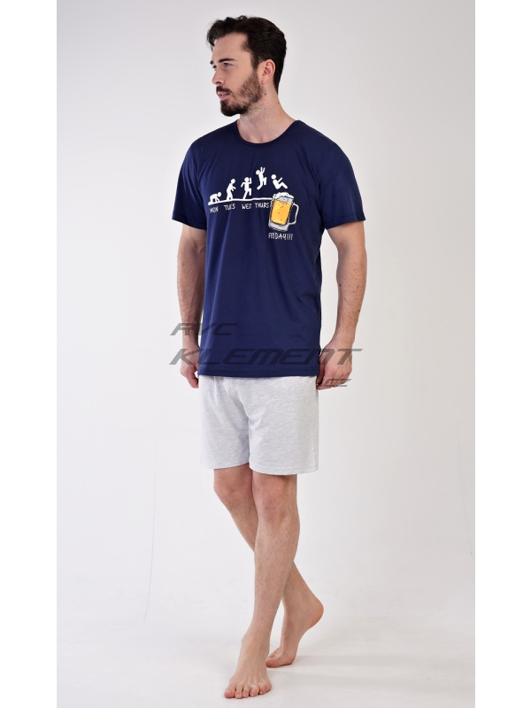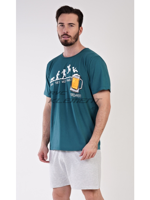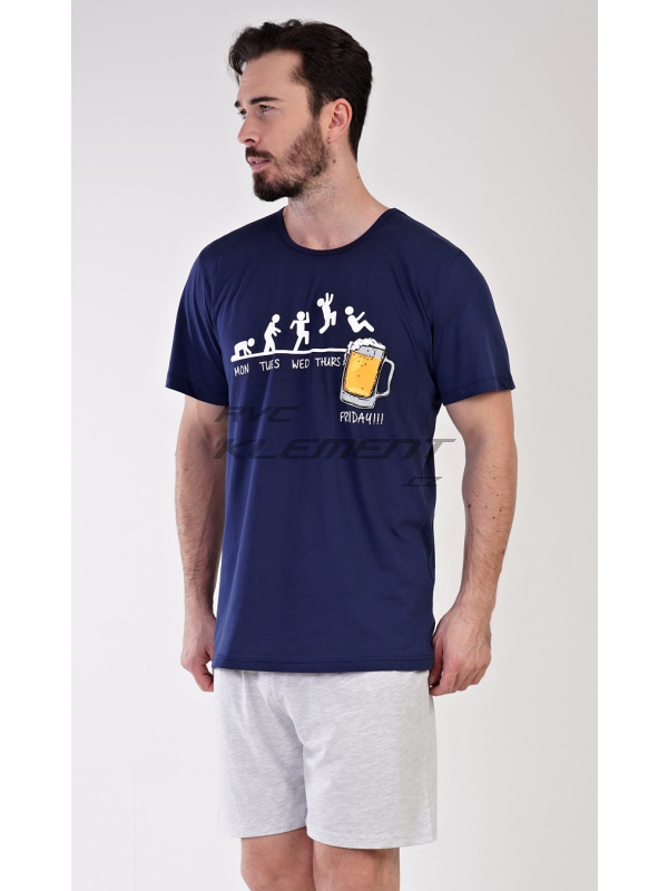 Pánské pyžamo šortky Filip. Pánské pyžamo šortky Filip. Pánské pyžamo se skládá z trička s krátkým rukávem a krátkých šortkových kalhot. Jednobarevné tričko s kulatým výstřihem je zdobeno veselým obrázkem panáčků, kteří se s blížícím víkendem nemůžou dočkat sklenice piva. Tričko doplňují jednobarevné šortky, které mají v pase gumu a šňůrku ke stažení. Nemají kapsy. Použitý materiál je příjemný a poddajný na dotek. Podíl bavlny u trička je 100% a šortek 70%. Pyžamo je vhodné i na denní nošení.