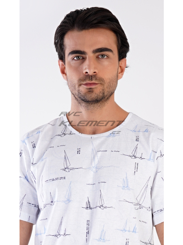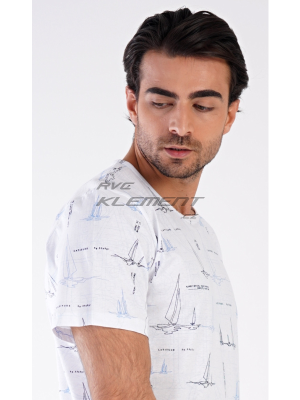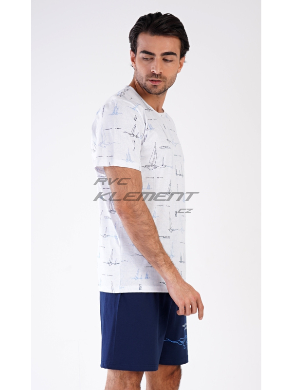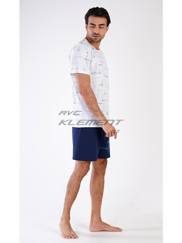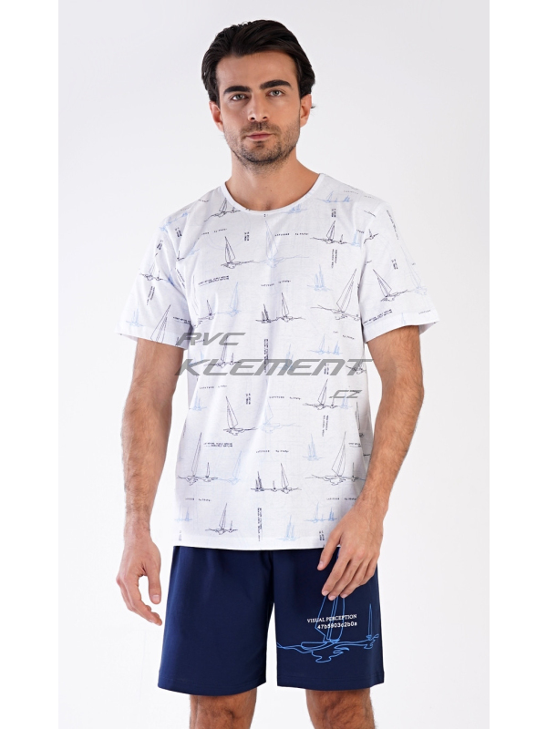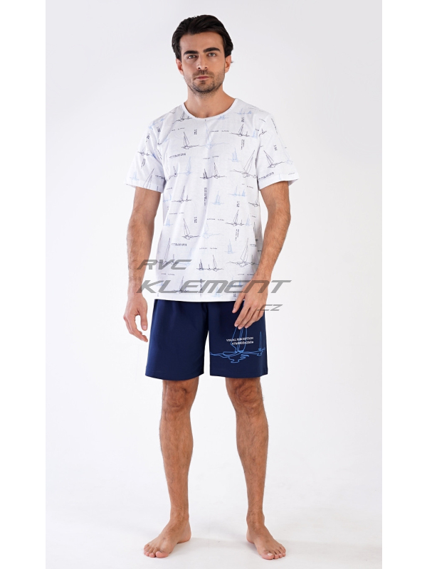 Pánské pyžamo šortky Plachetnice. Pánské bavlněné pyžamo šortky Plachetnice. Pánské pyžamo se skládá z trička s krátkým rukávem a krátkých šortkových kalhot. Jednobarevné tričko je potištěno konturami plachetnic. Tričko vhodně doplňují jednobarevné krátké kalhoty, na kterých se opakuje potisk s námořnickým motivem. Šortky mají v pase gumu, šňůrku na stažení, nemají kapsy. Použitý materál s obsahem bavlny 100% je příjemný a poddajný na dotek. Pokyny pro údržbu: - 100% bavlna Míry naměřené na výrobku: