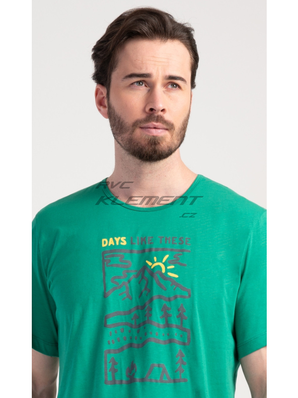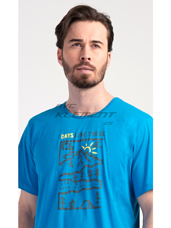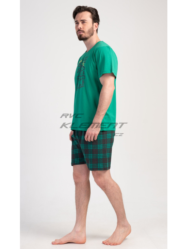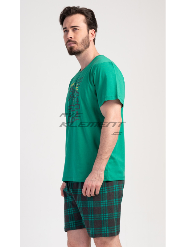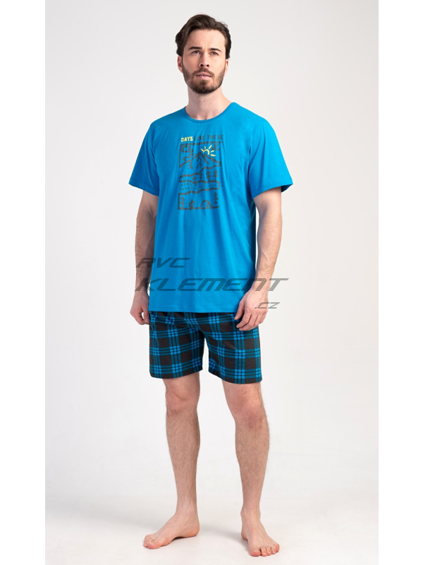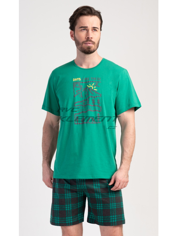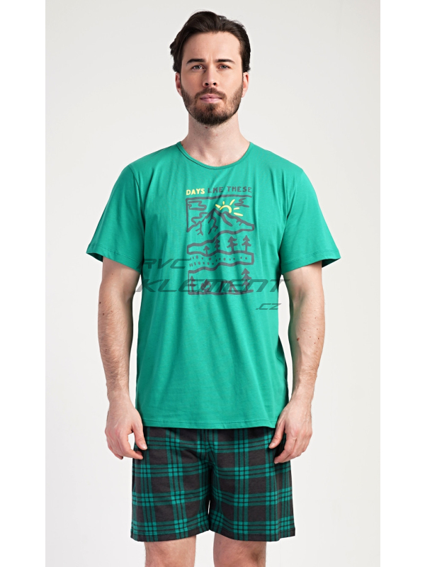 Pánské bavlněné pyžamo šortky Outdoor. Pánské pyžamo se skládá z trička s krátkým rukávem a krátkých šortkových kalhot. Na tričku je obrázek lesnaté krajiny a nápis ’Days like these’. Tričko doplňují kárované šortky, které mají v pase gumu a šňůrku na stažení, nemají kapsy. Použitý materiál s obsahem bavlny 100% je příjemný a poddajný na dotek.