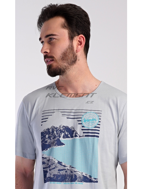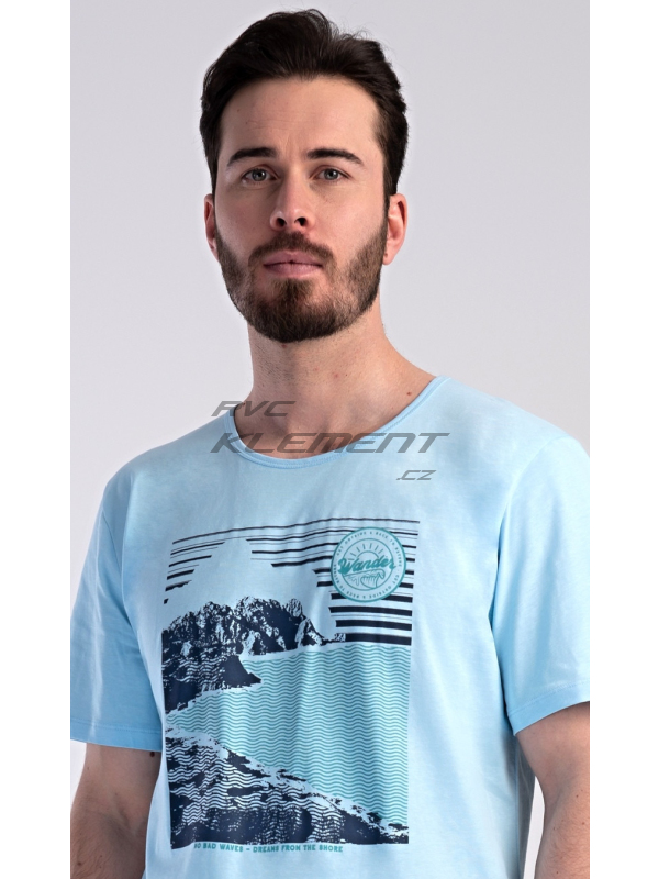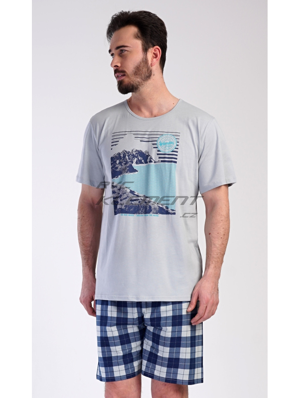 Pánské bavlněné pyžamo šortky Wander. Pánské pyžamo se skládá z trička s krátkým rukávem a krátkých šortkových kalhot. Na tričku je obrázek skalnatého pobřeží a drobný nápis ’Wander’. Tričko doplňují kárované šortky, které mají v pase gumu a šňůrku na stažení, nemají kapsy. Toto pyžamo je vhodným dárkem pro všechny milovníky moře, hor a cestování. Použitý materiál s obsahem bavlny 100% je příjemný a poddajný na dotek.